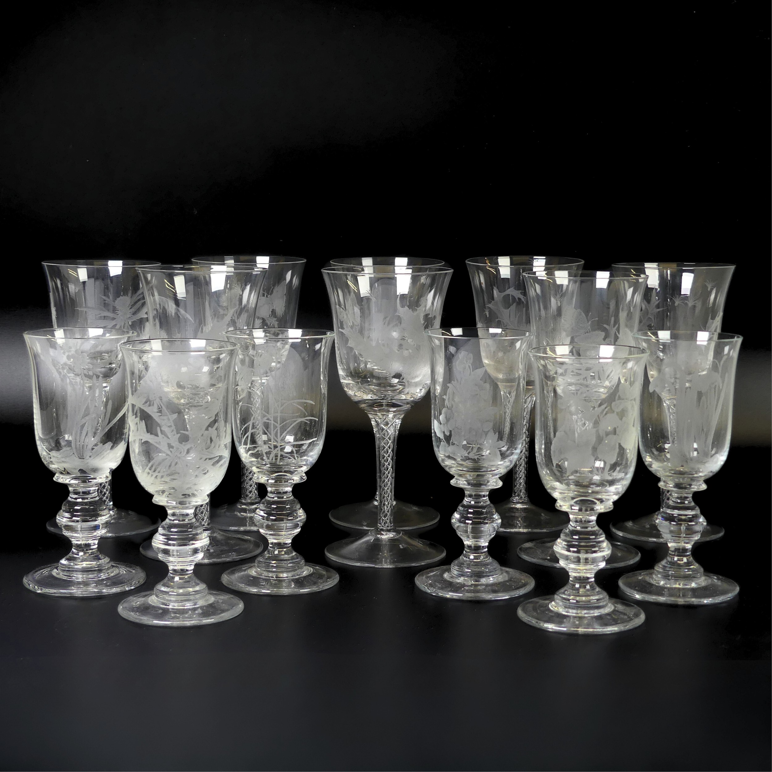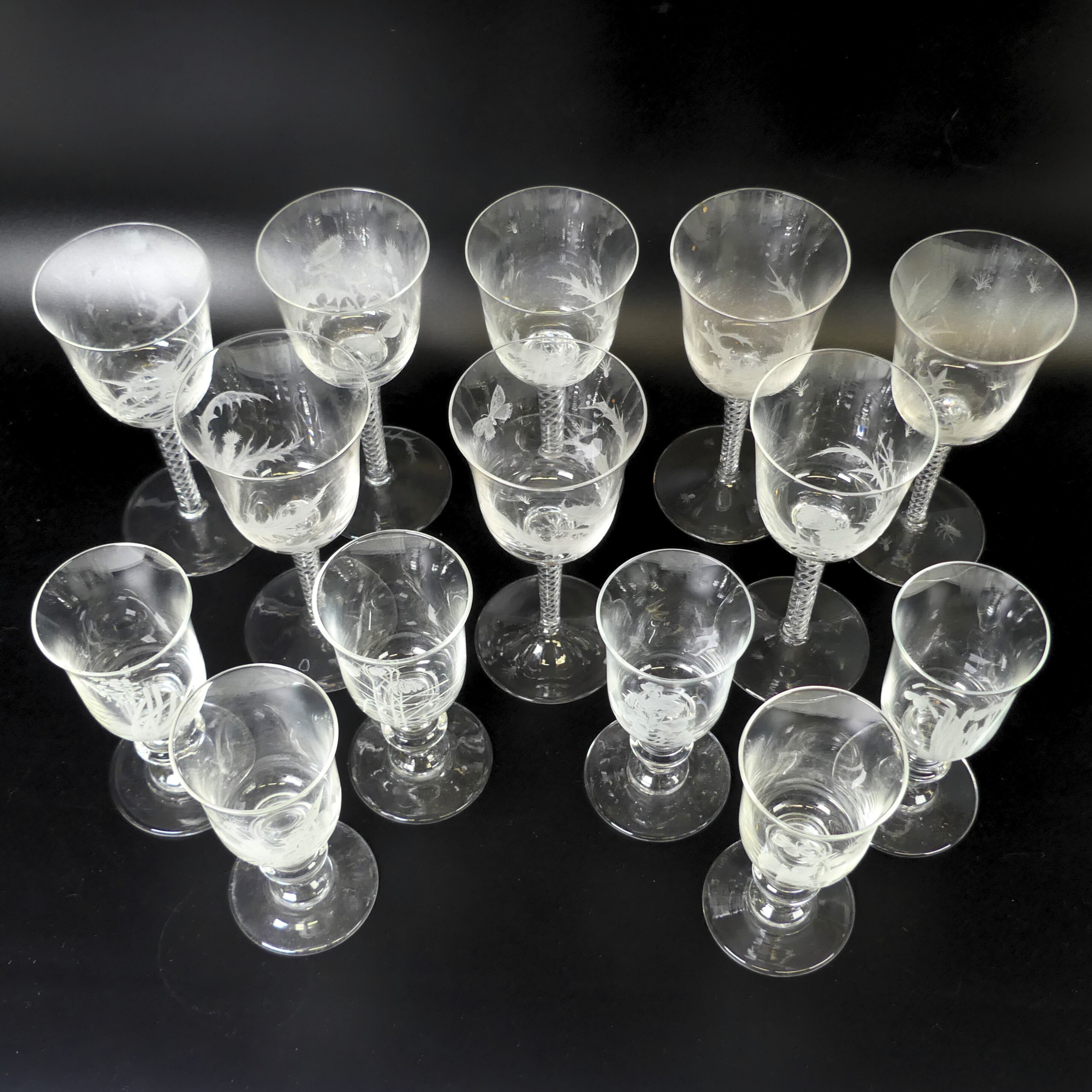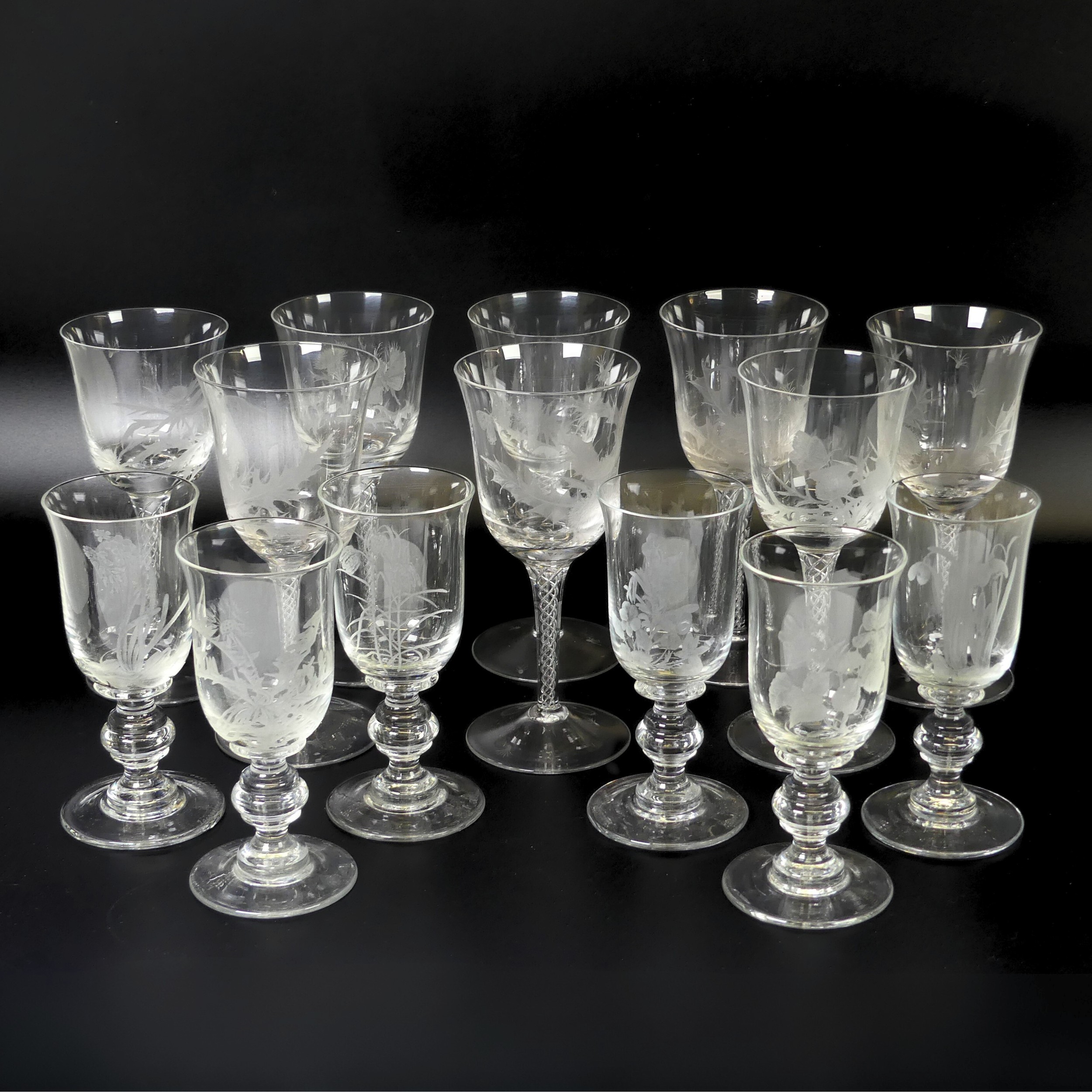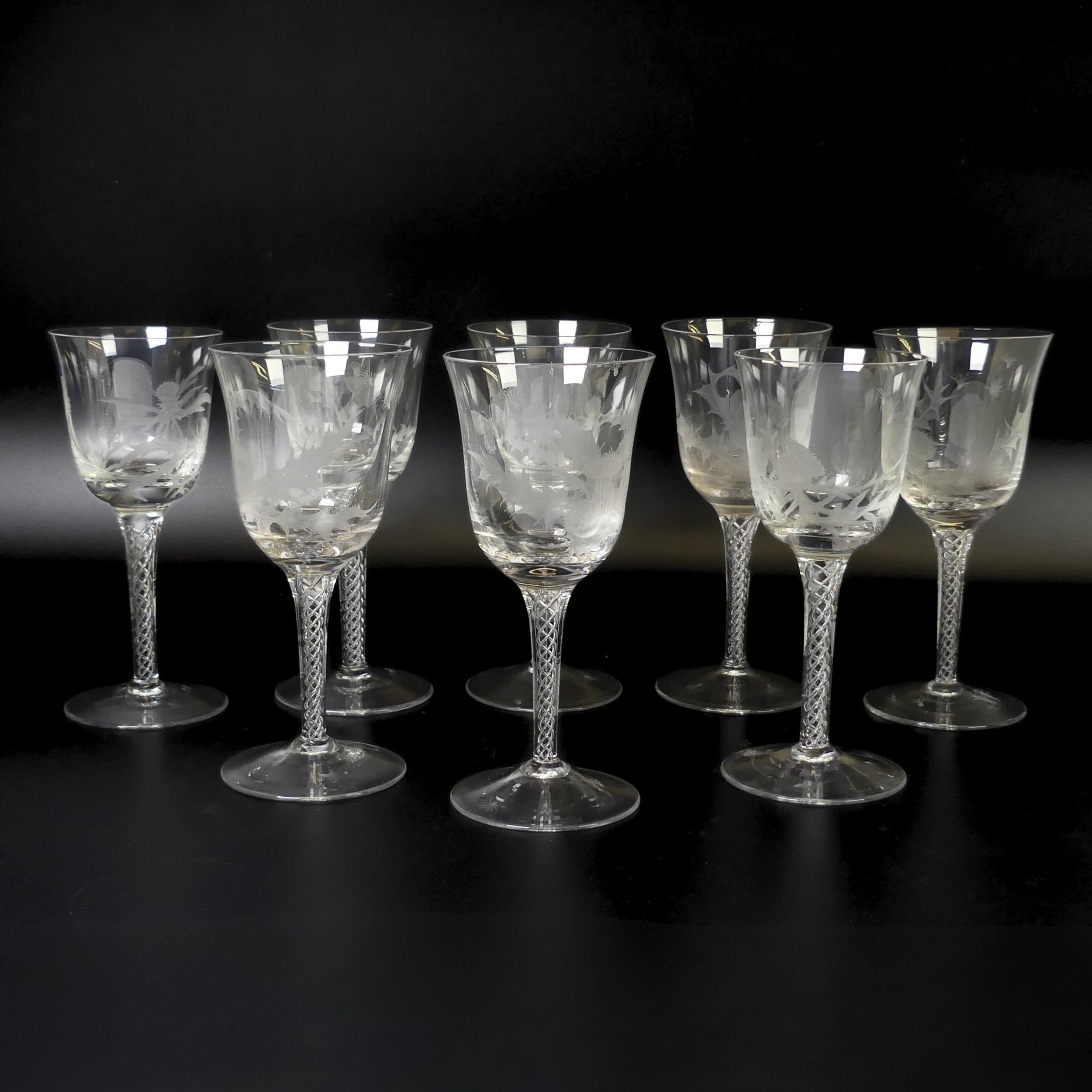 A set of eight Jacobite-style Wine Glasses, with twisted stem and etched thistle motif, the foot with further foliage, D 7cm x H 15.5cm, together with a set of six Jacqueline Allwood engraved Glasses, H 13cm (14)
