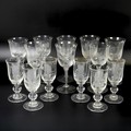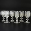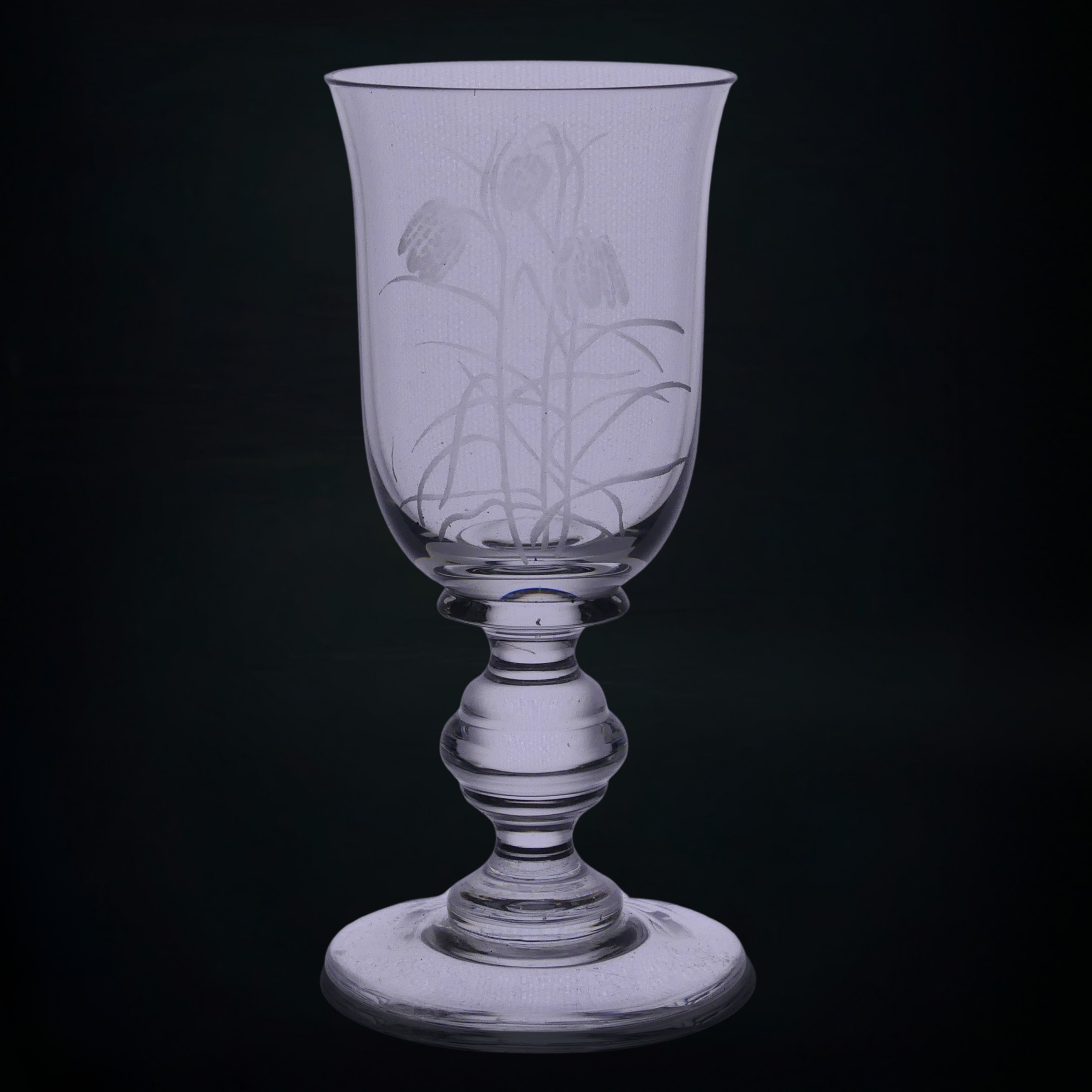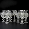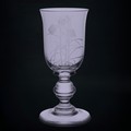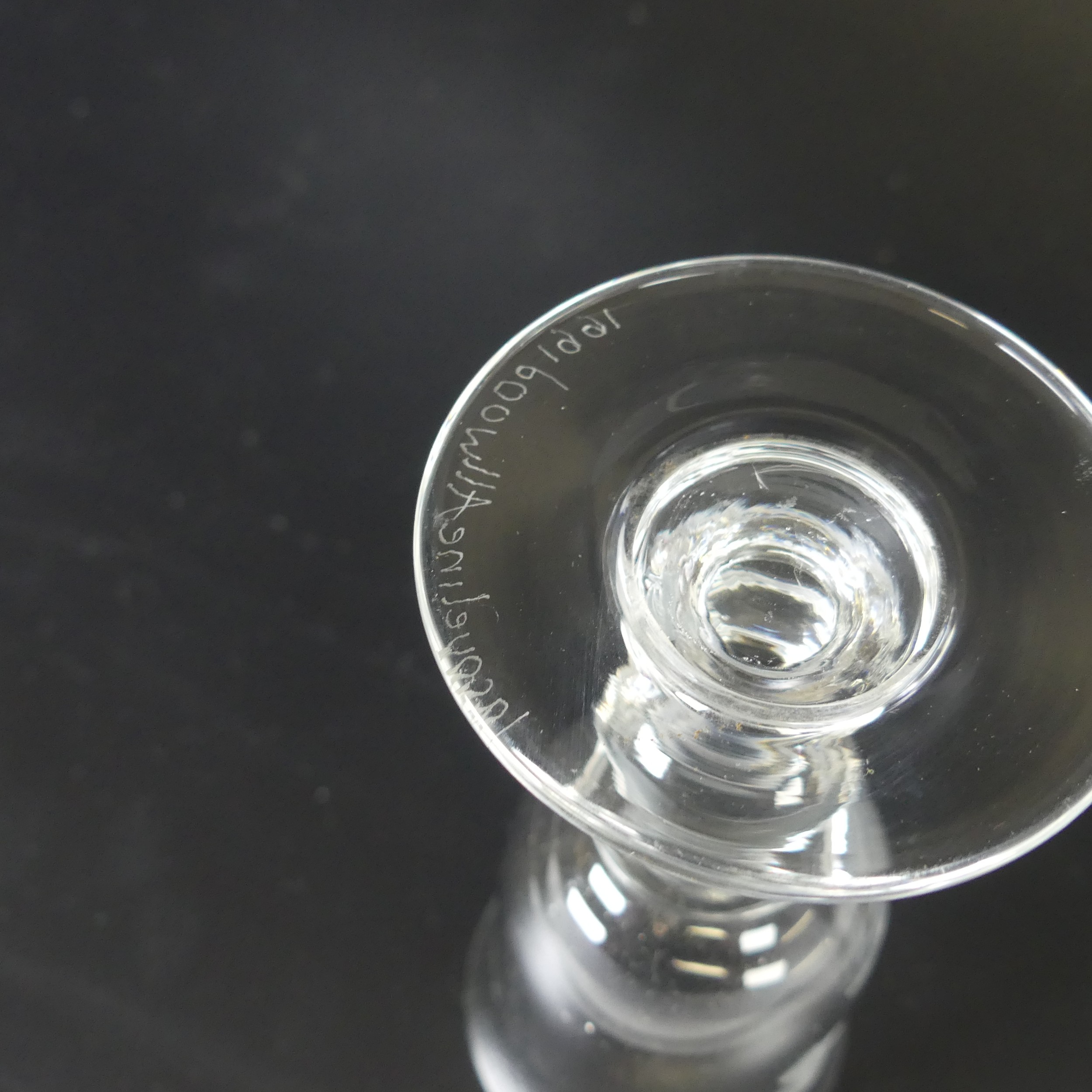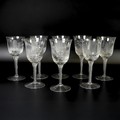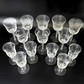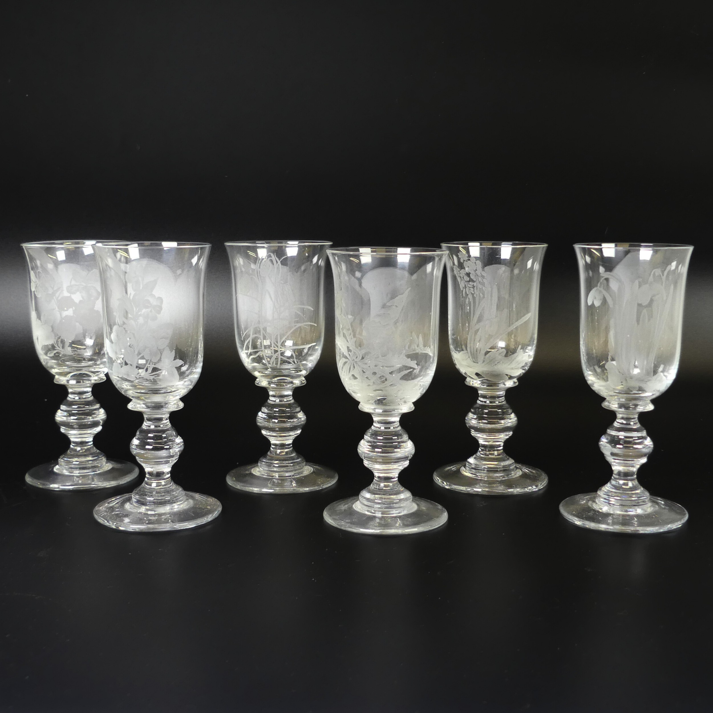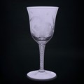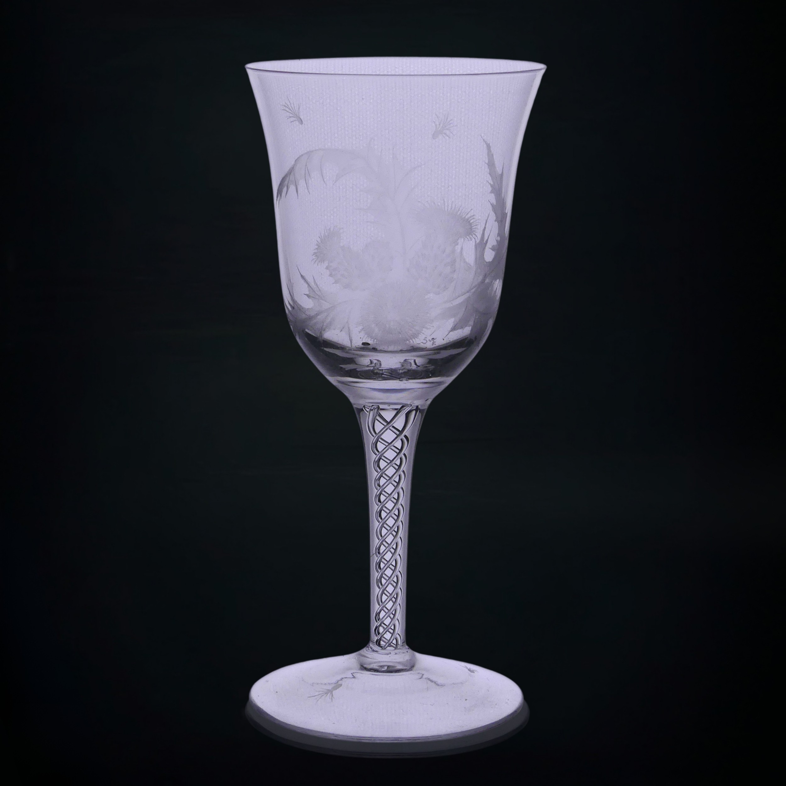 A set of eight Jacobite-style Wine Glasses, with twisted stem and etched thistle motif, the foot with further foliage, D 7cm x H 15.5cm, together with a set of six Jacqueline Allwood engraved Glasses, H 13cm (14)