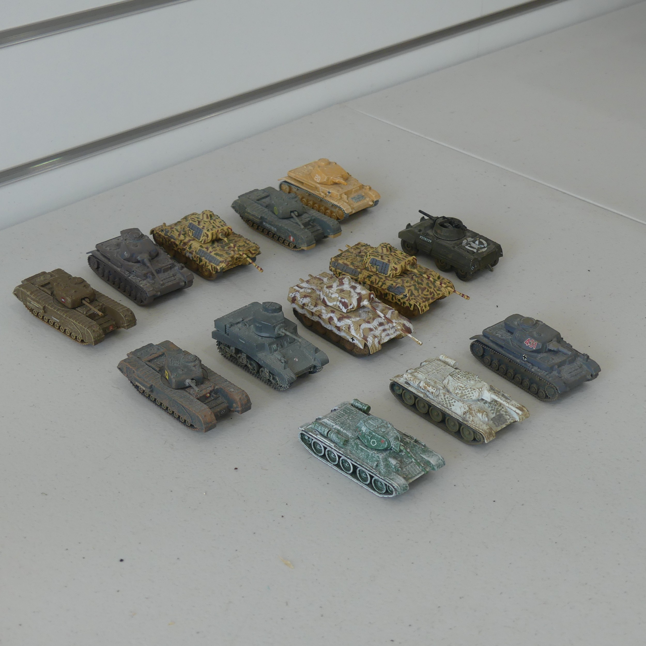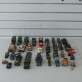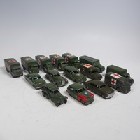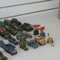 Corgi Toys; Forty-five unboxed playworn military Vehicles, including; No.1106 Mobile Airfield Radar, 2 x No.353 "RAF" Radar Scanners, 13 x 1:50 scale diecast model Tanks(Panther, T34, Panzer IV, M3 Stuart, etc), Juniors No.E2011 US Army Tanker, Corgi Major 'International' 6x6 Trucks, No.1134 Big Bedford Tractor Unit US Army, Commer "Ambulance", etc, note, some being repainted and with losses, see images(a lot)