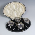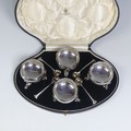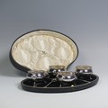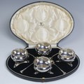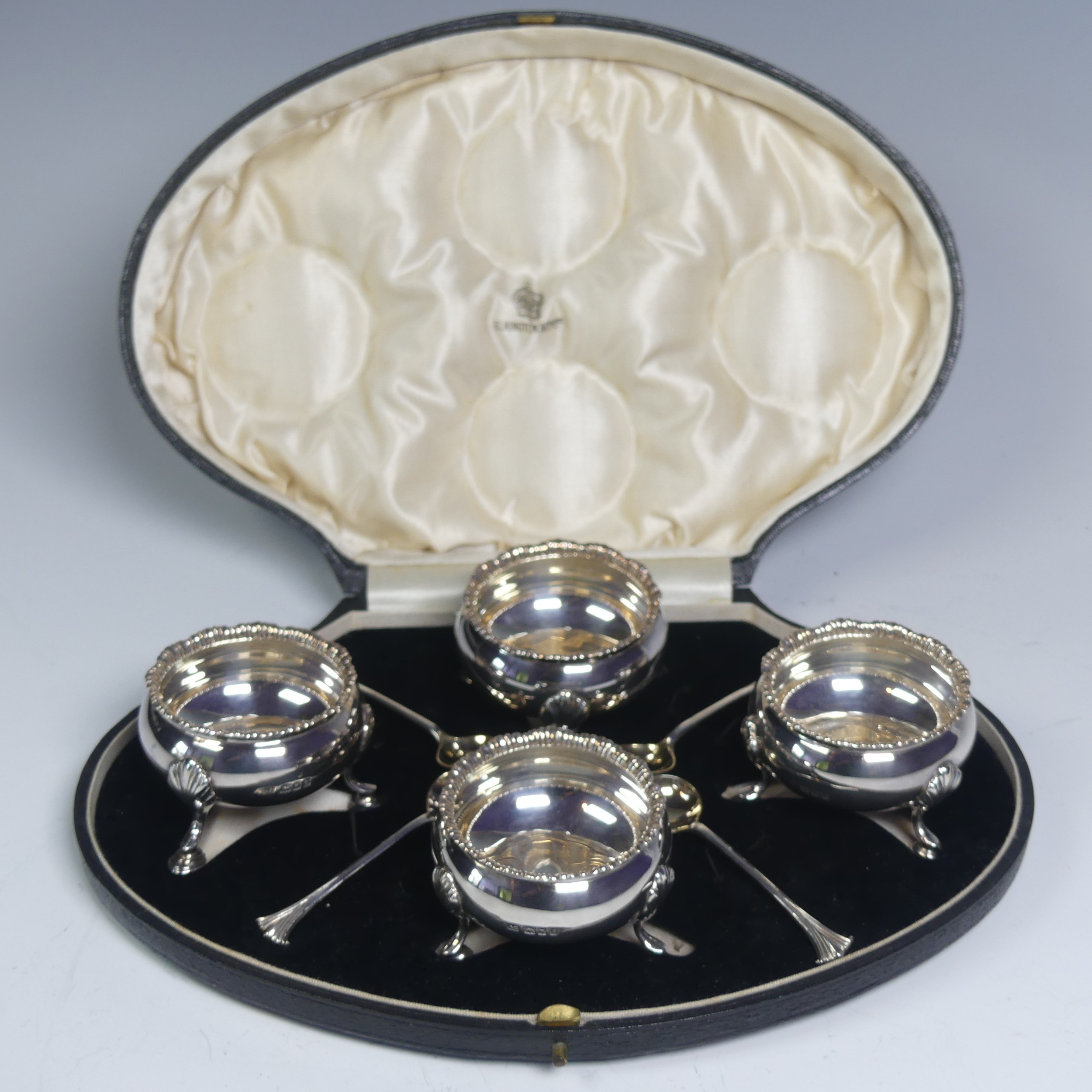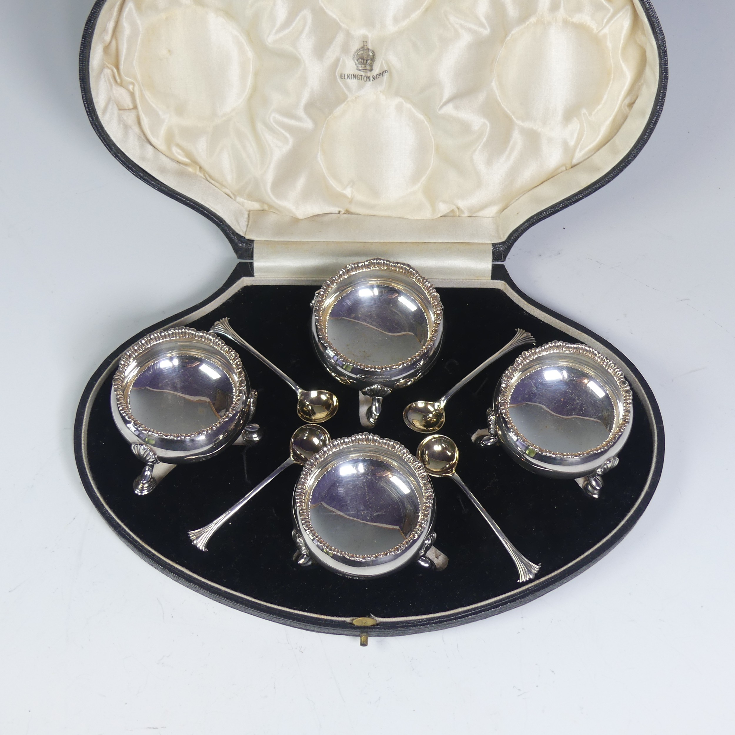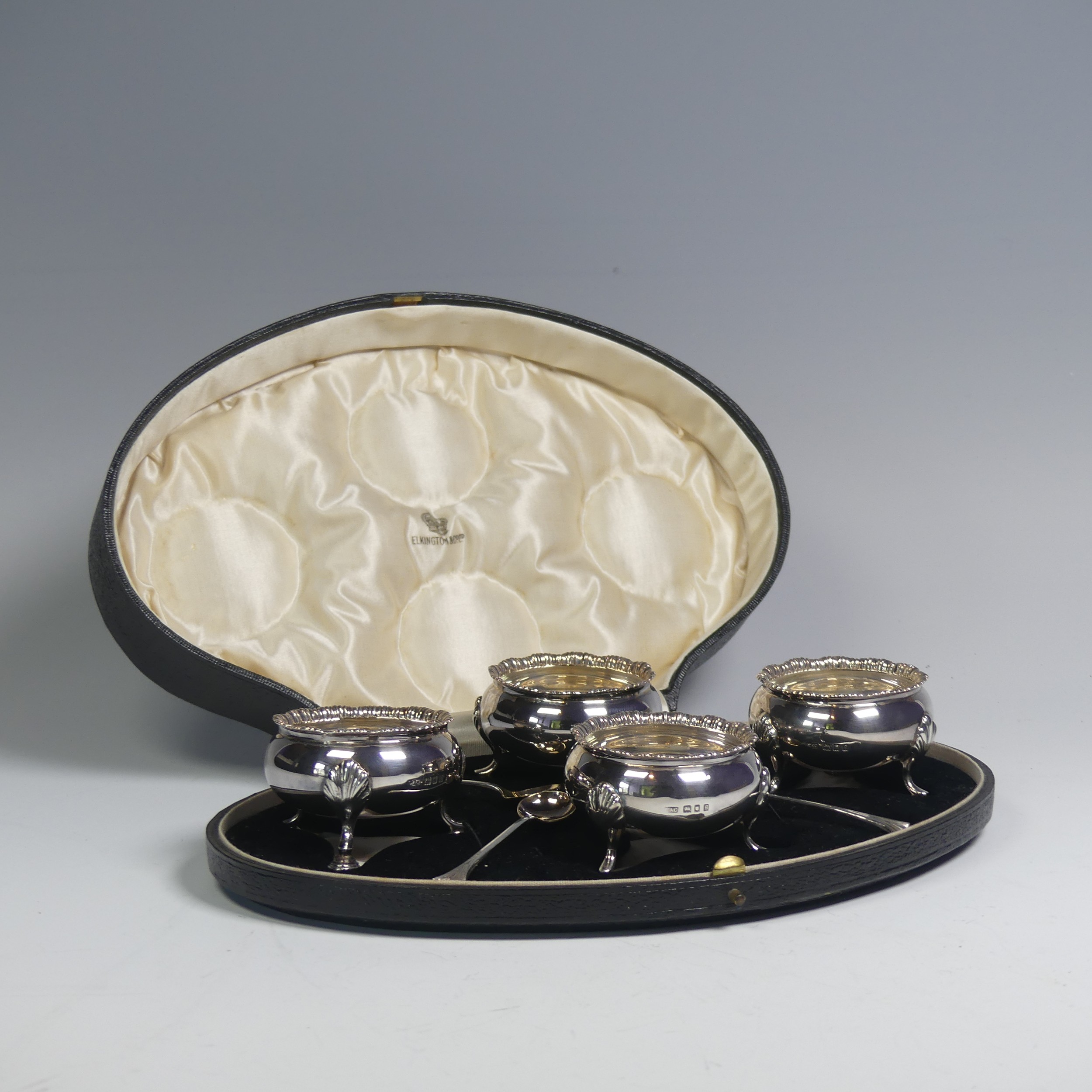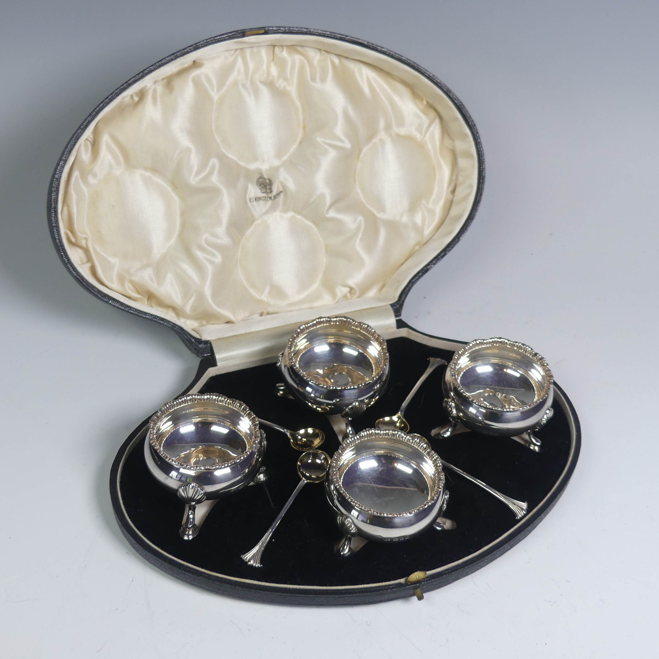 A cased set of four George V silver Open Salts, by Crichton Brothers, hallmarked London 1922, of cauldron form with gadrooned rim, raised on three shell capped hoof supports, together with a set of four salt spoons by Elkington & Co., hallmarked Birmingham 1922, approx. total weight 11.2ozt, in Elkington & Co. retailer's fitted presentation case.