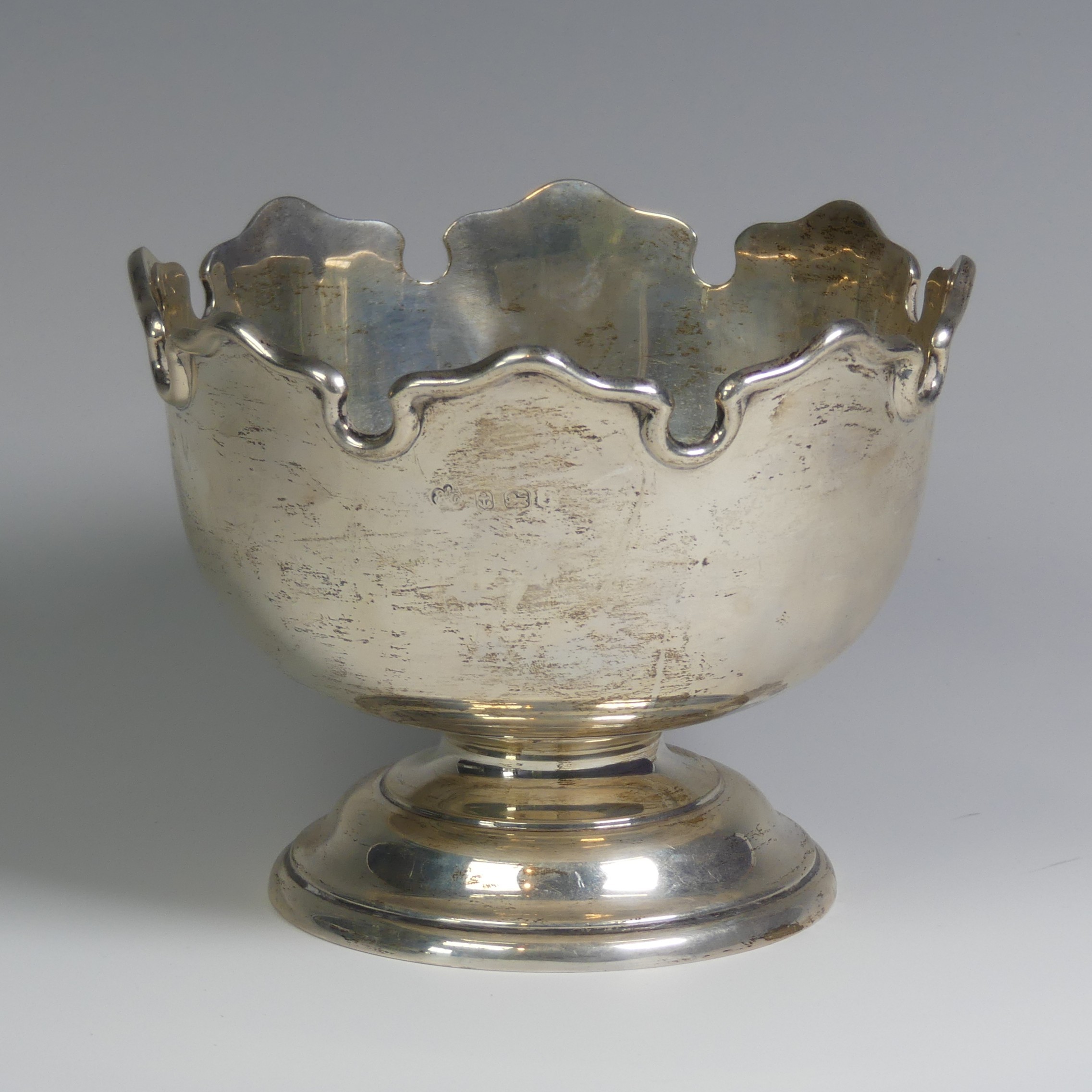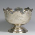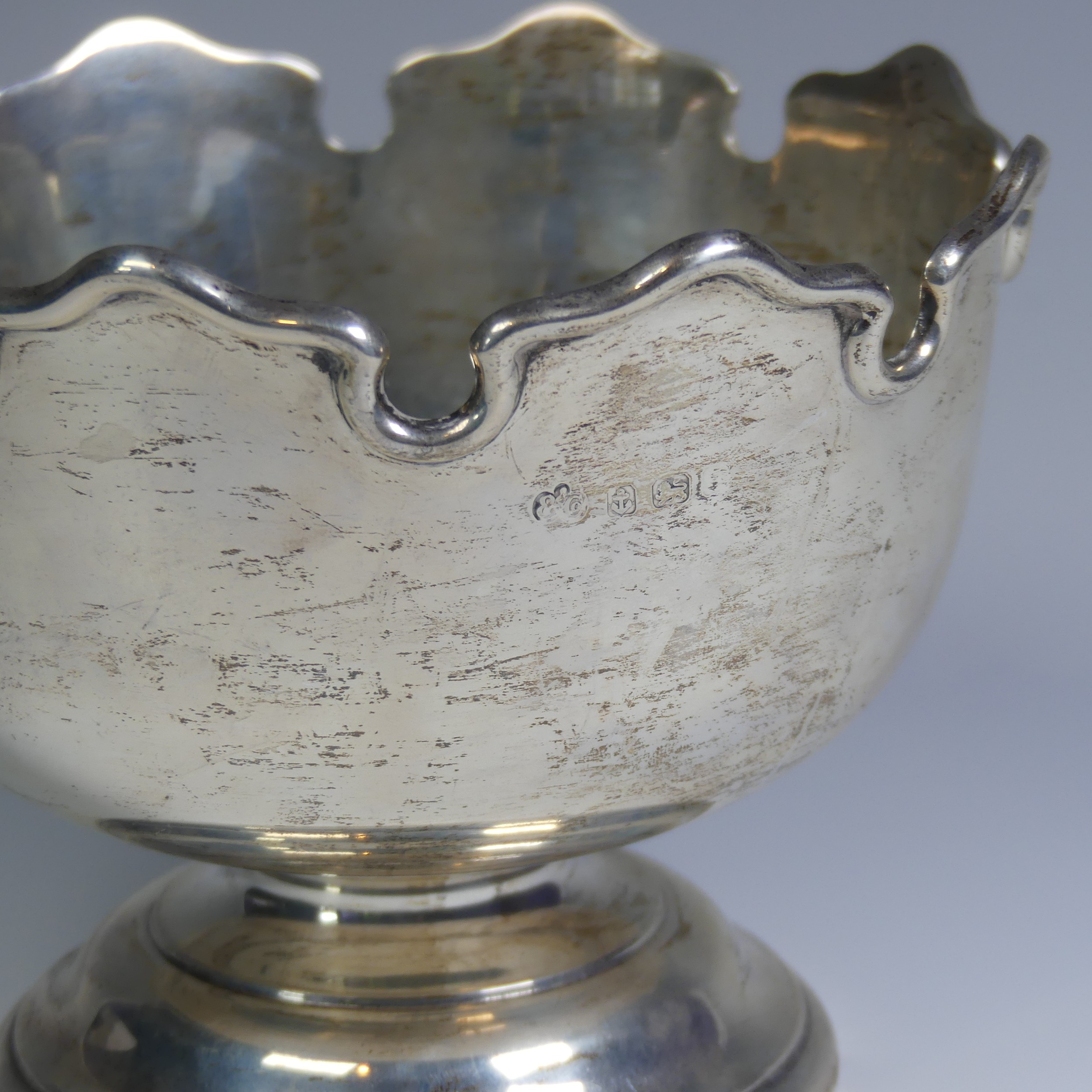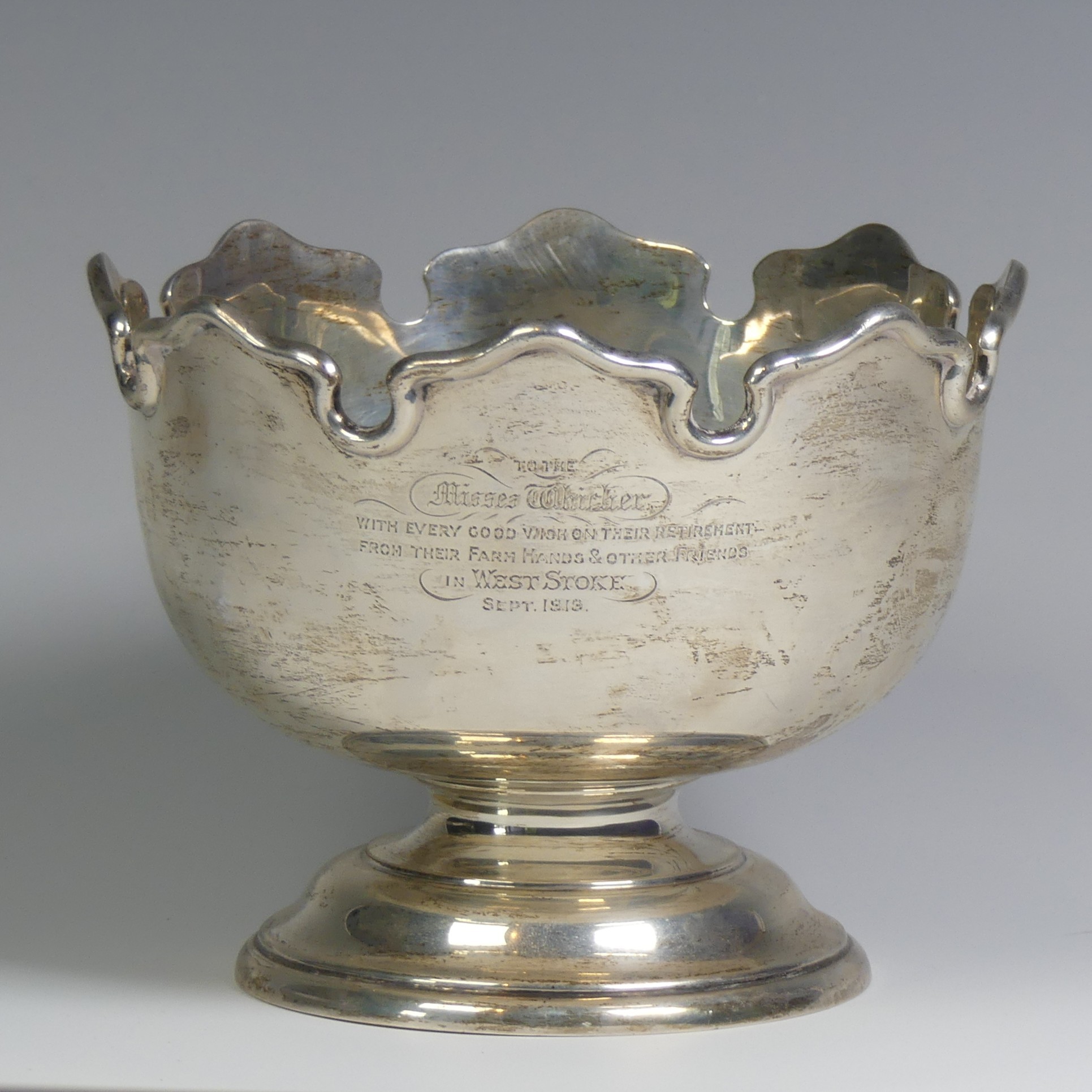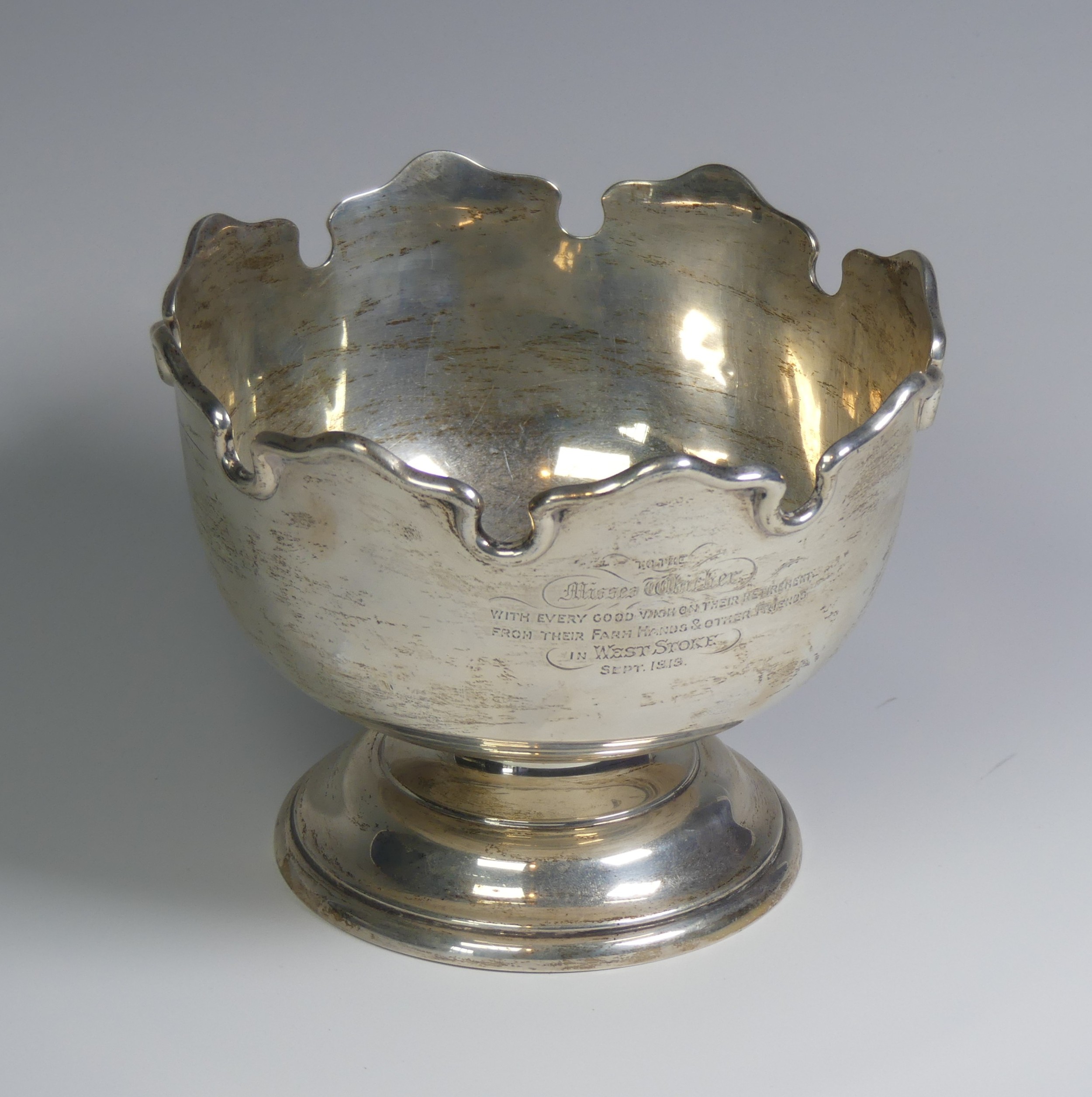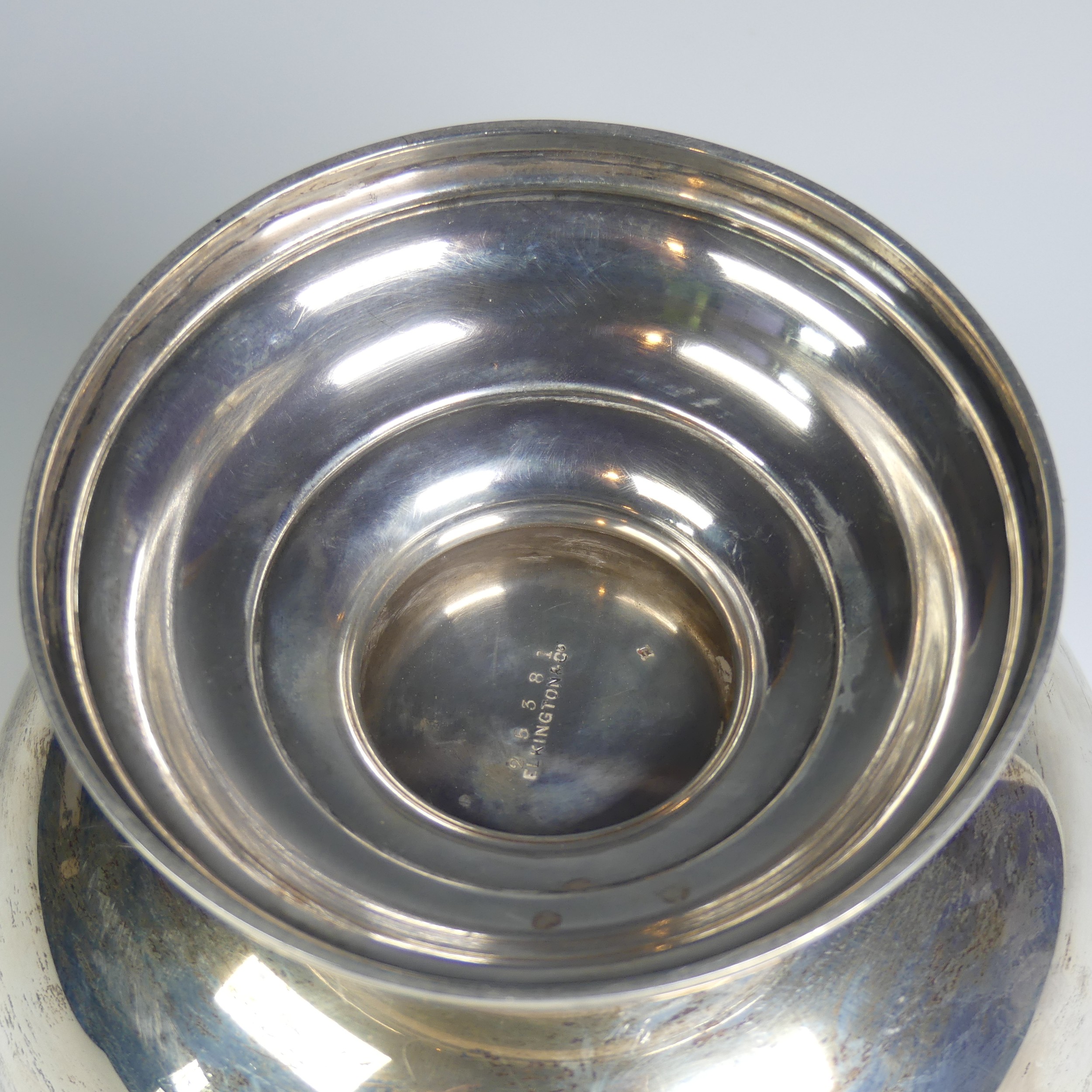 A George V silver Monteith style Bowl, by Elkington & Co Ltd., hallmarked Birmingham, date letter rubbed, with presentation inscription dated 1919, the underside of foot marked with pattern no. 25381, 18cm diameter, 16.1ozt.