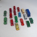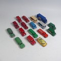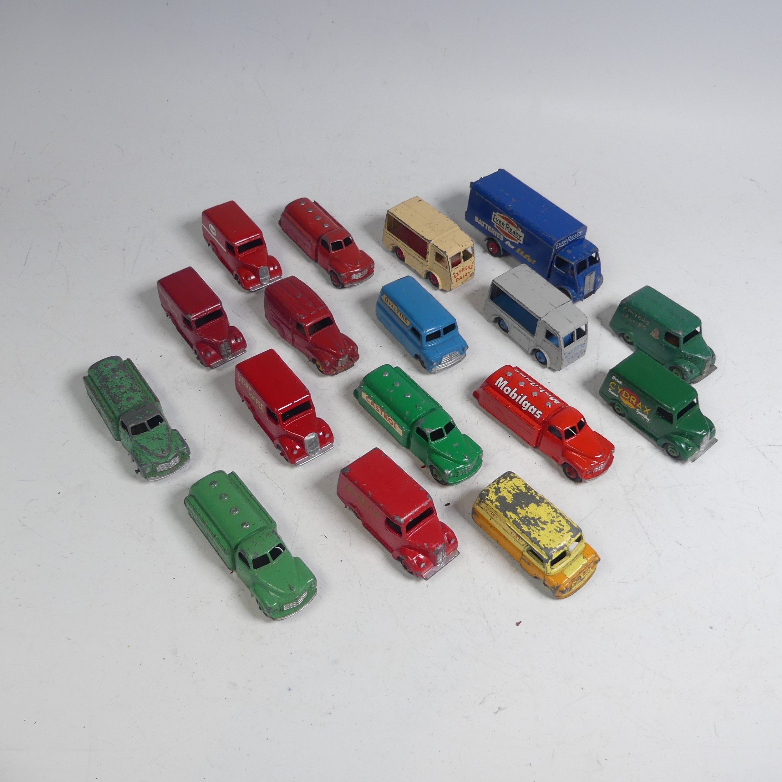 Dinky Toys; Seventeen unboxed playworn model Vans, including; Supertoys No.918 Guy 'Ever Ready' Van, six Trojan Vans(No.455 "Brooke Bond Tea", Sharp's Toffee, No.454 "Cydrax", No.452 "Chivers Jellies", No.455 "Esso", No.451 "Dunlop"), two 30V ''Express Daily'' Electric Vans, No.481 Bedford "Ovaltine", another Bedford Van, five Studebaker Petrol Tankers(Mobilgas, Petrol, Castrol), and a No.471 Austin ''Nestle'' Van, some have been repainted(a lot)