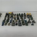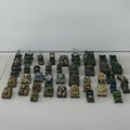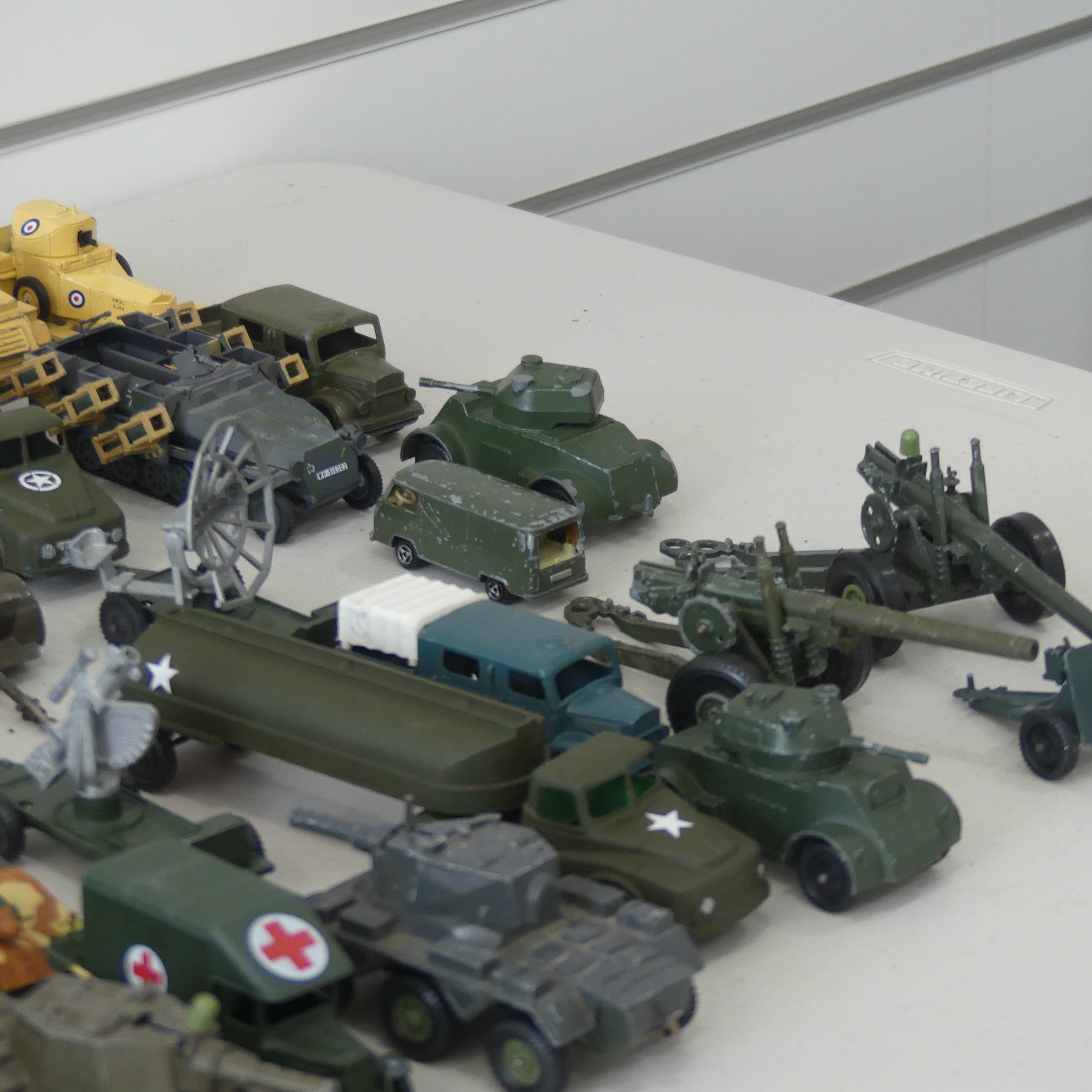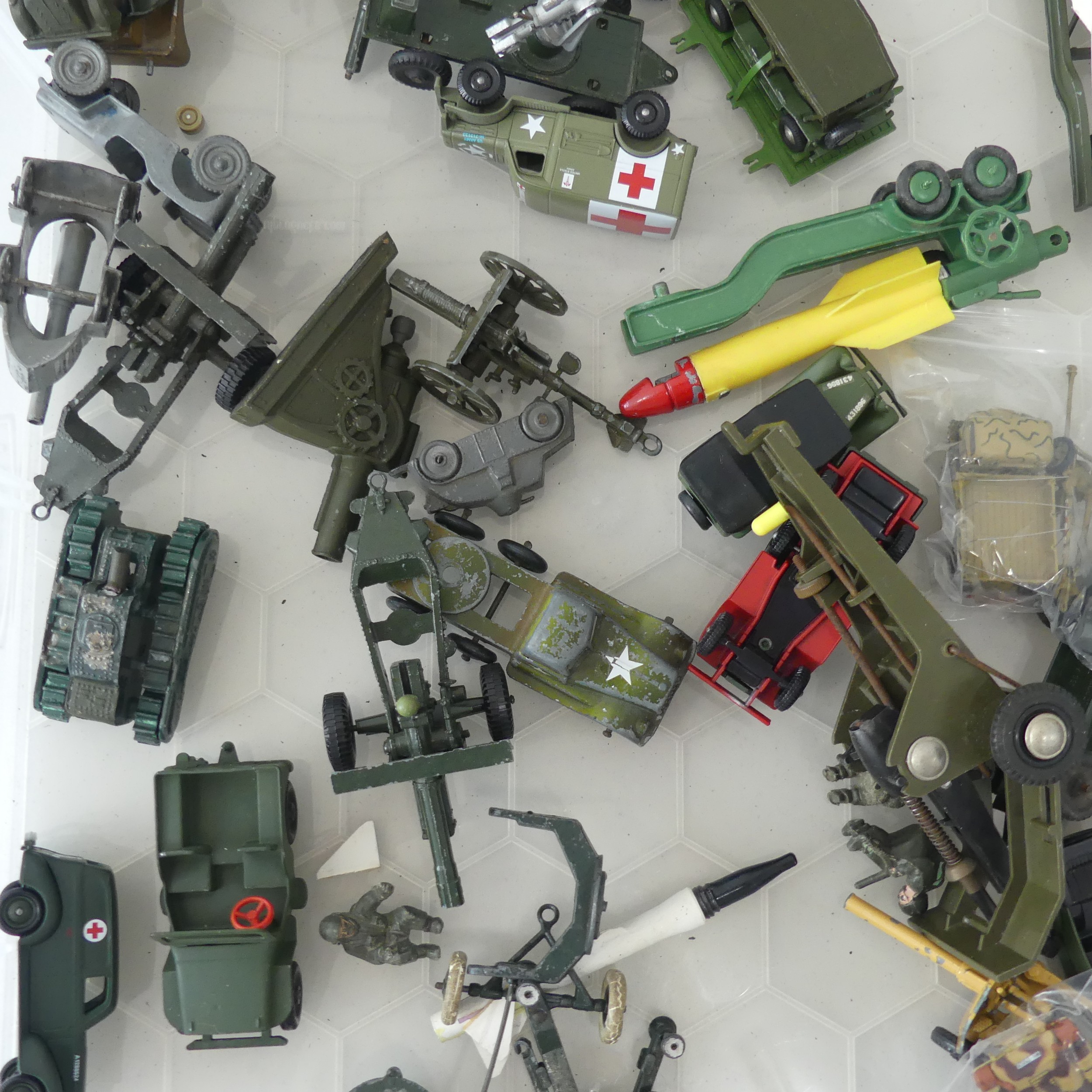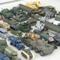 A very large collection of diecast military Vehicles, over 100 vehicles in total, including; Crescent, Lesney, A Lone Star product Modern Army Series, Budgie, Days Gone, etc, such as Tanks, Missile Launchers, Personnel Carries, Jeeps, Ambulances, Guns, Figurines, etc, some plastic models, note, some have been repainted and some have small losses/damages, see images(a lot)