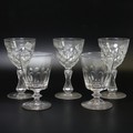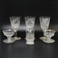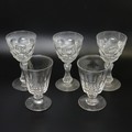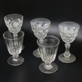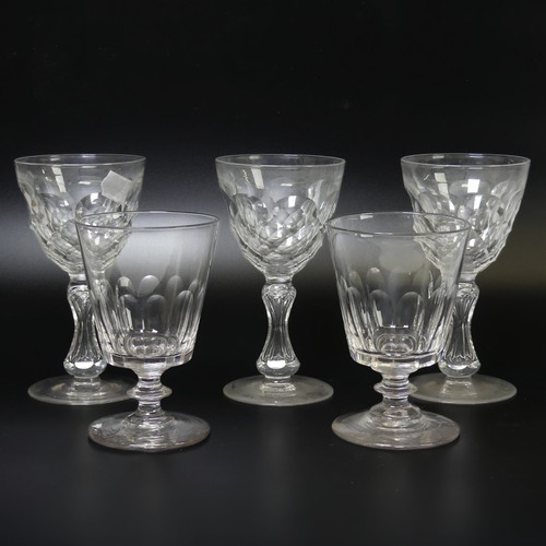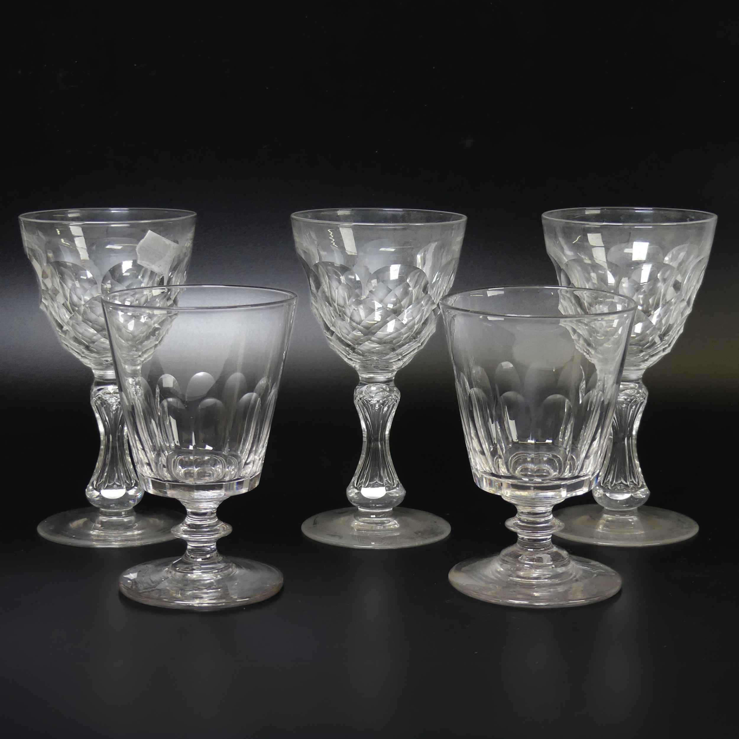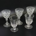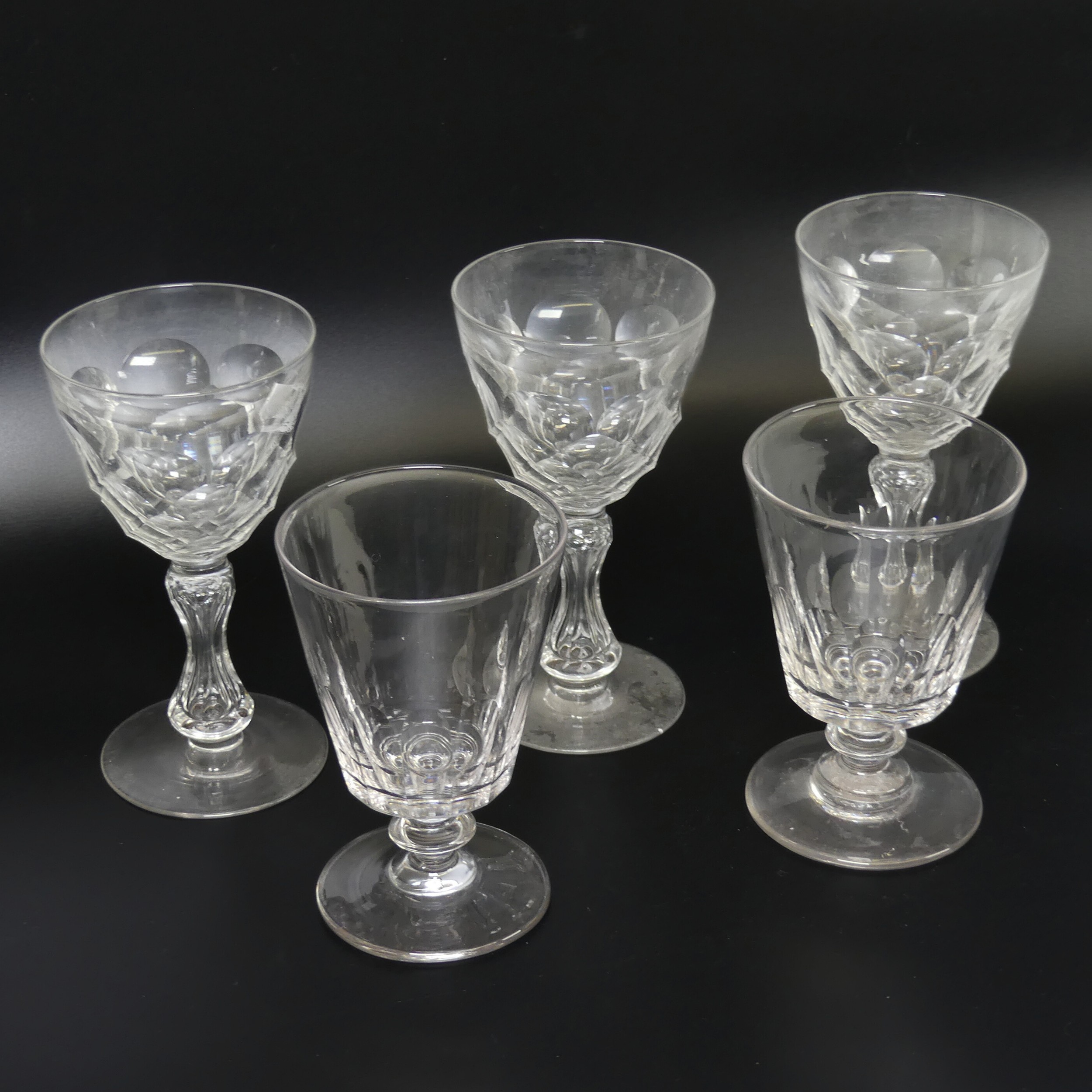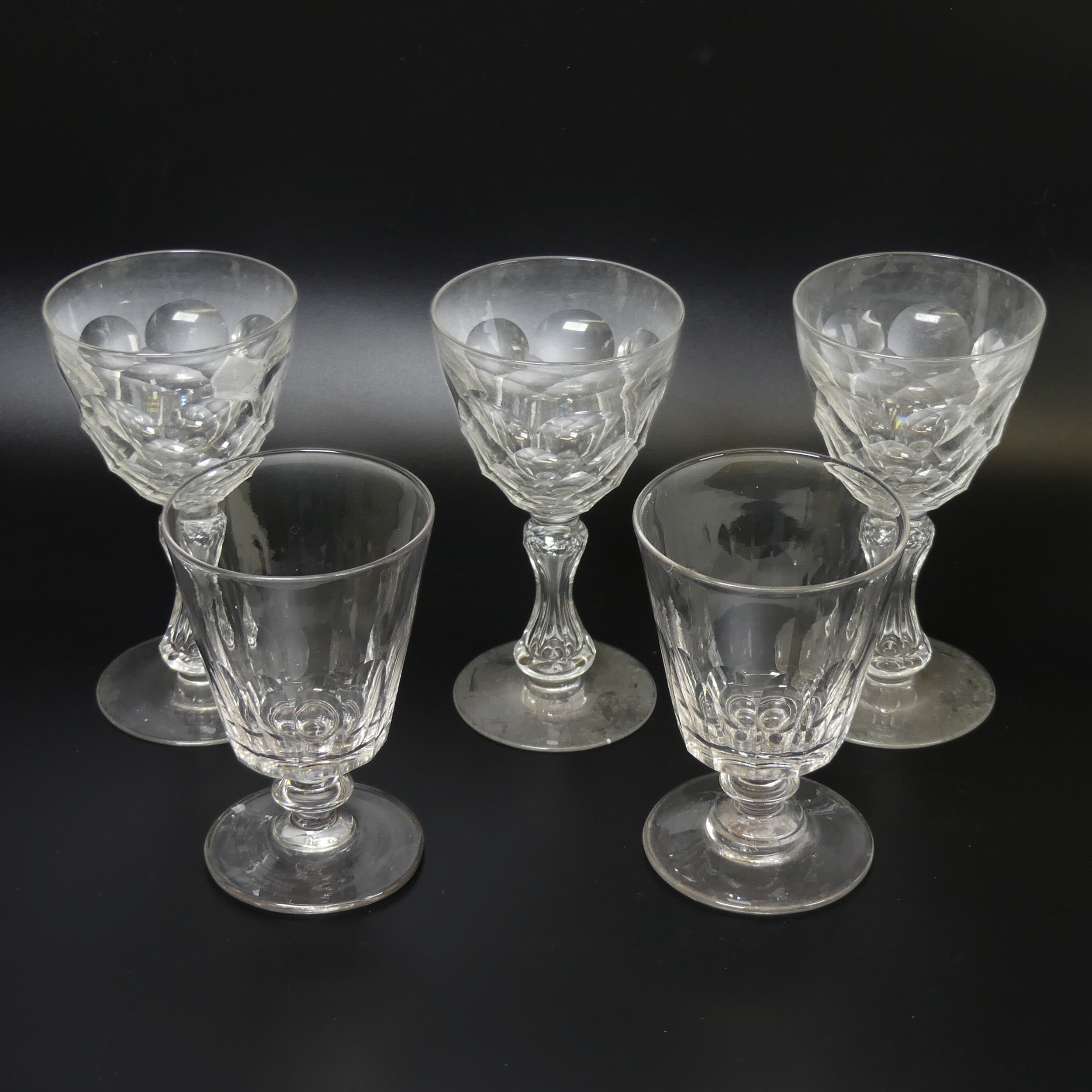 A pair of fine Georgian glass Rummers, with cut bucket bowl on knopped stem, H 12.8cm, together with a pair of antique wine Glasses, with faceted bowl on waisted stem, H 15.5cm and an antique Rummer, of elongated form, H 14.5cm (5)