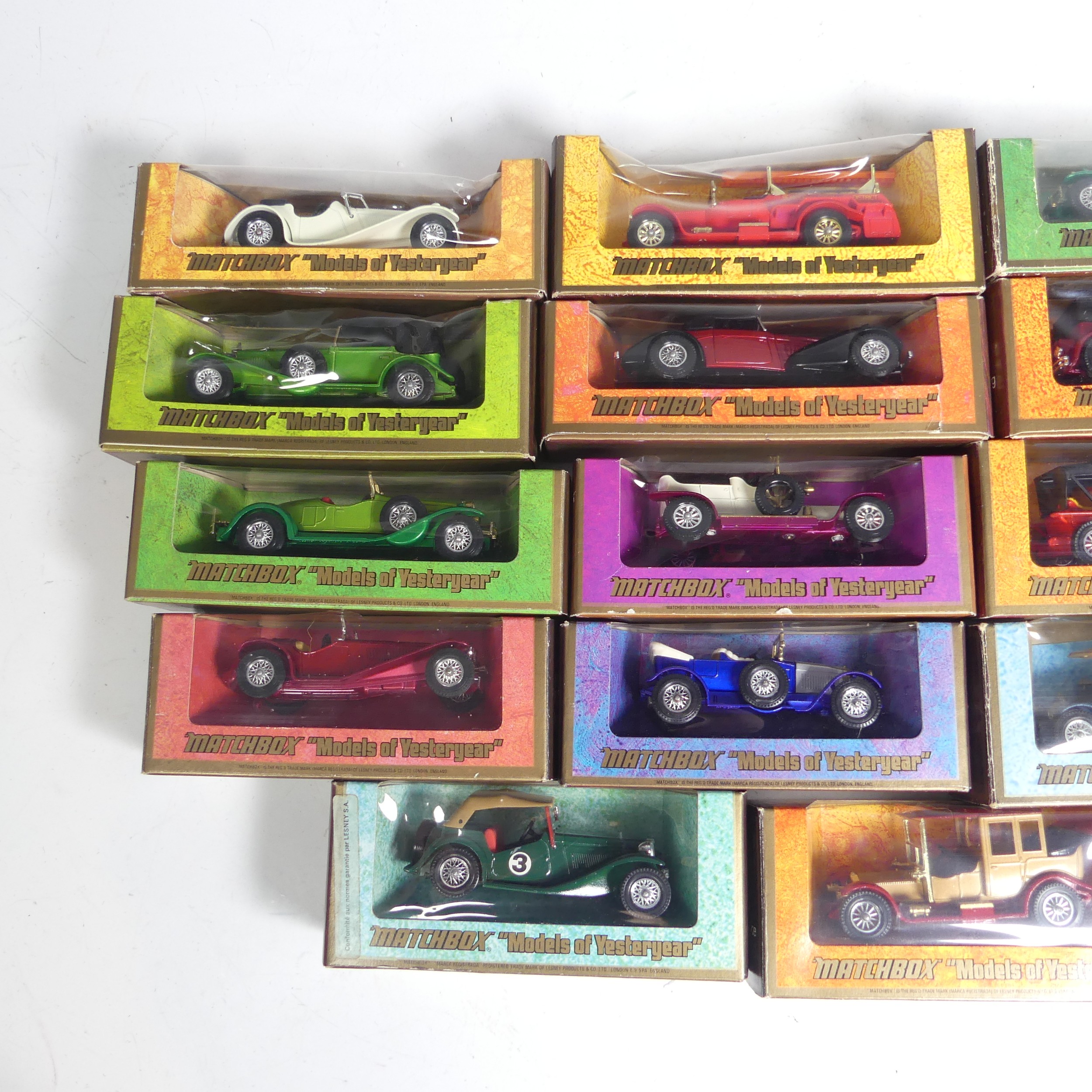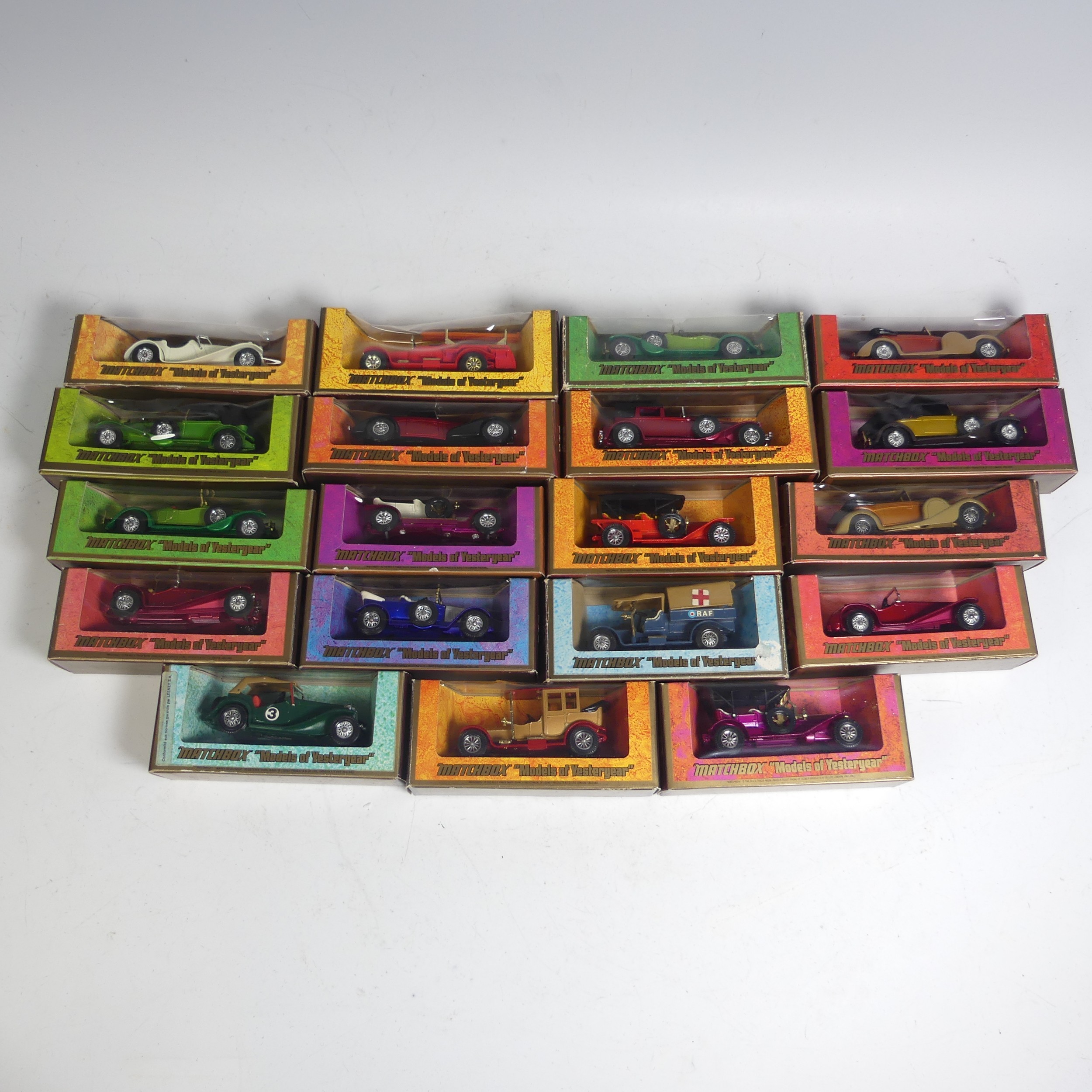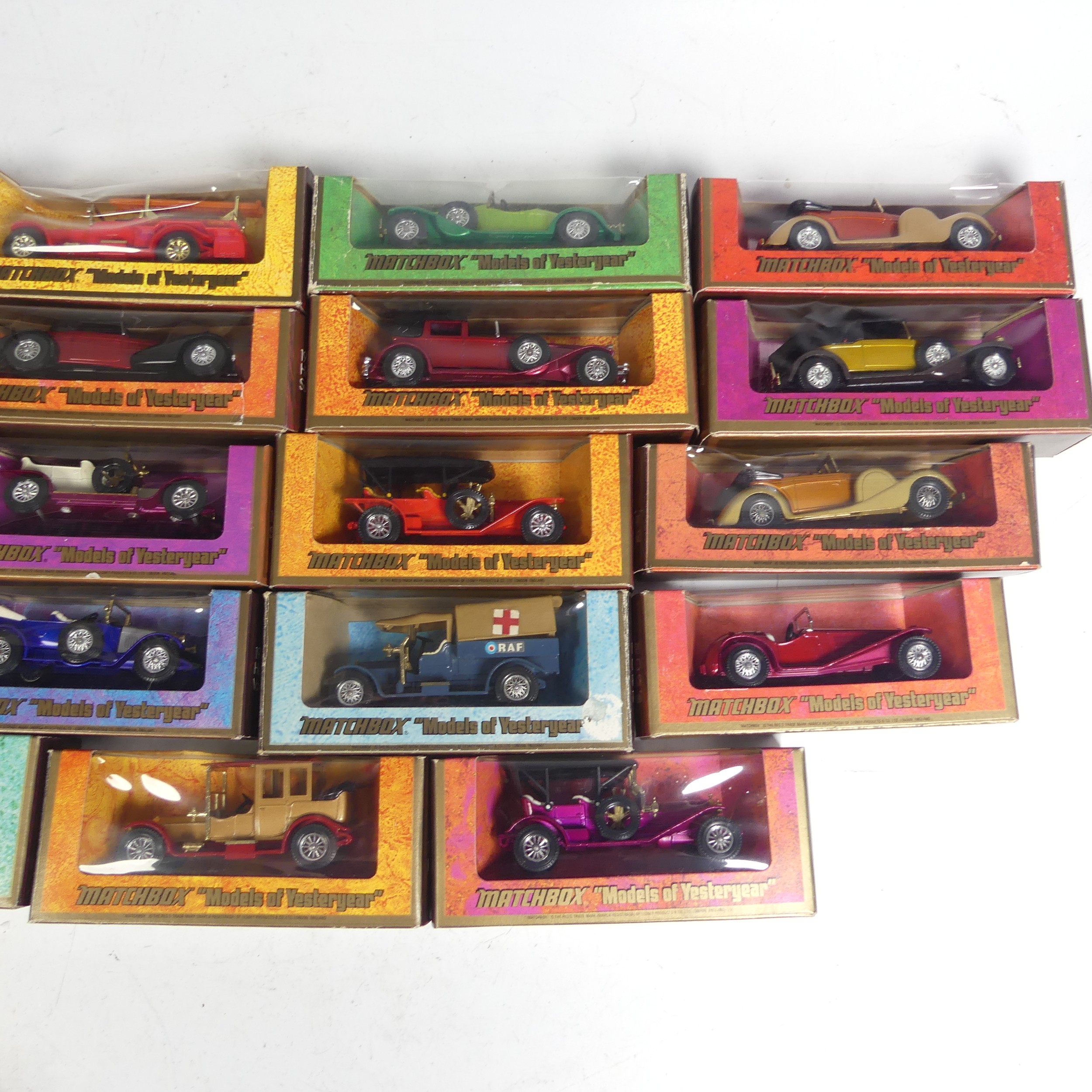 Matchbox Models of Yesteryear; A group of nineteen woodgrain box issues including; Y-6 1920 Rolls Royce Fire Engine ''Borough Green & District'', Y-1 1936 Jaguar SS-100 in off white, 2 x Y-11 Lagonda Drophead Coupe one with orange body and the other red, Y-7 1912 Rolls Royce, Y-4 1930 Model 'J' Duesenberg, etc(a lot)