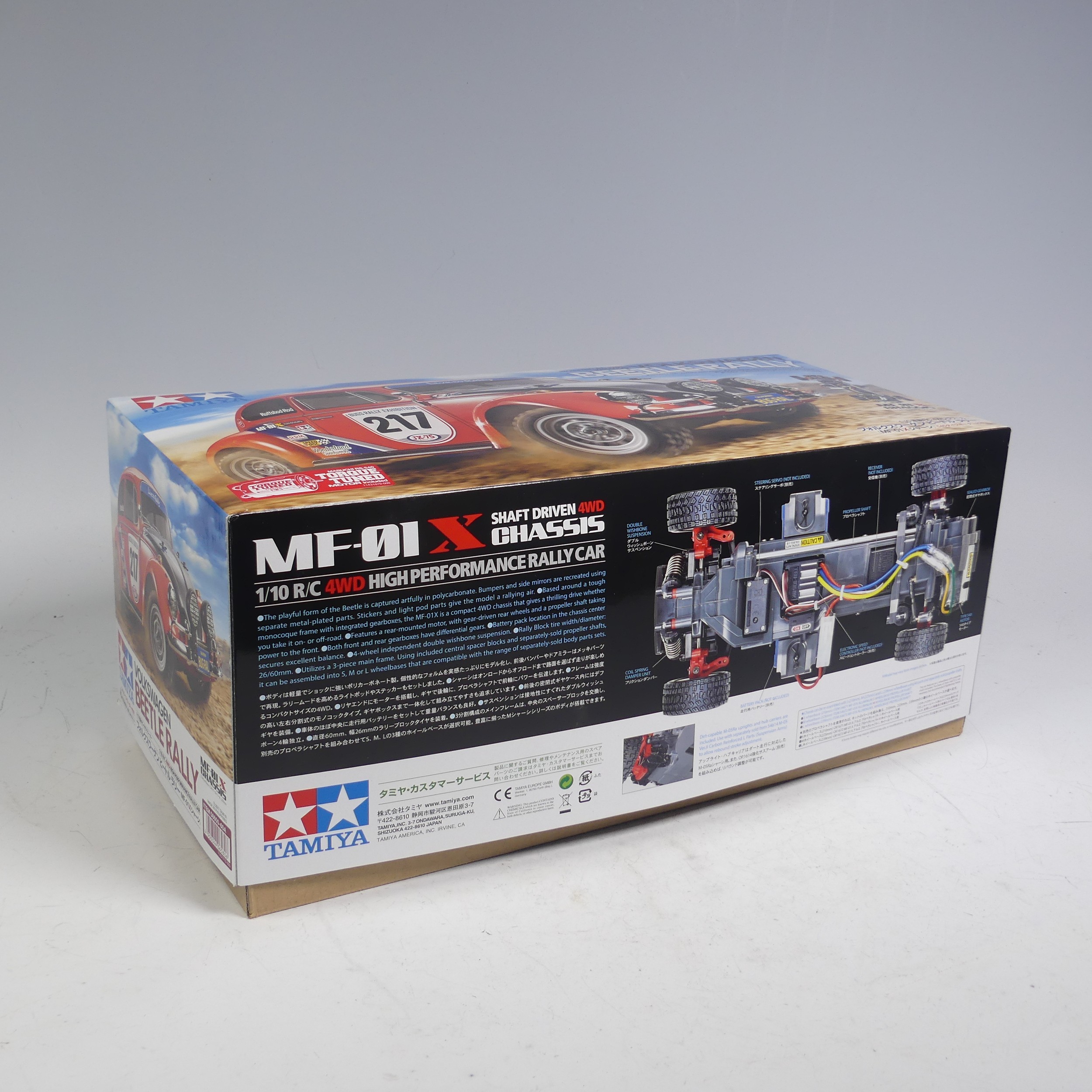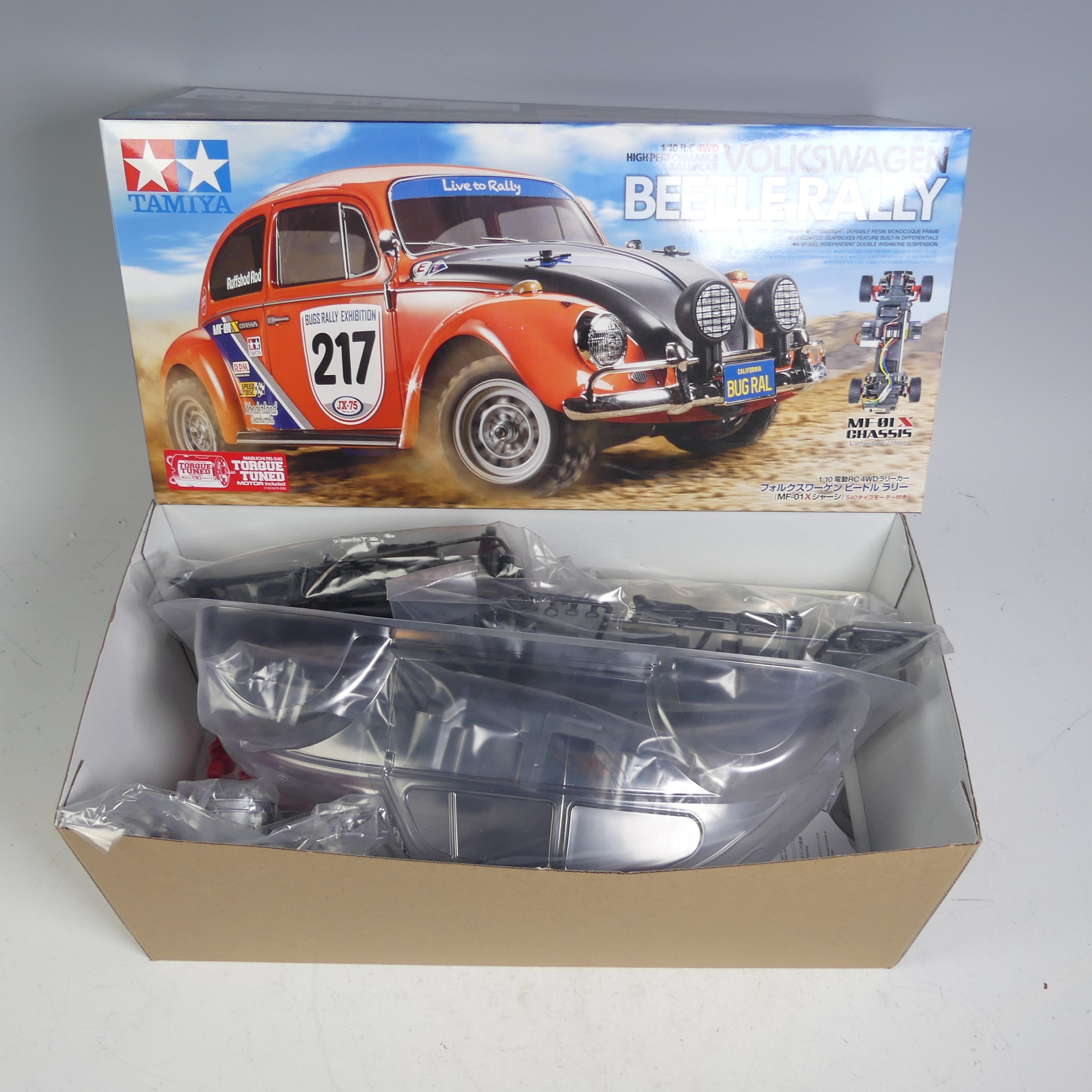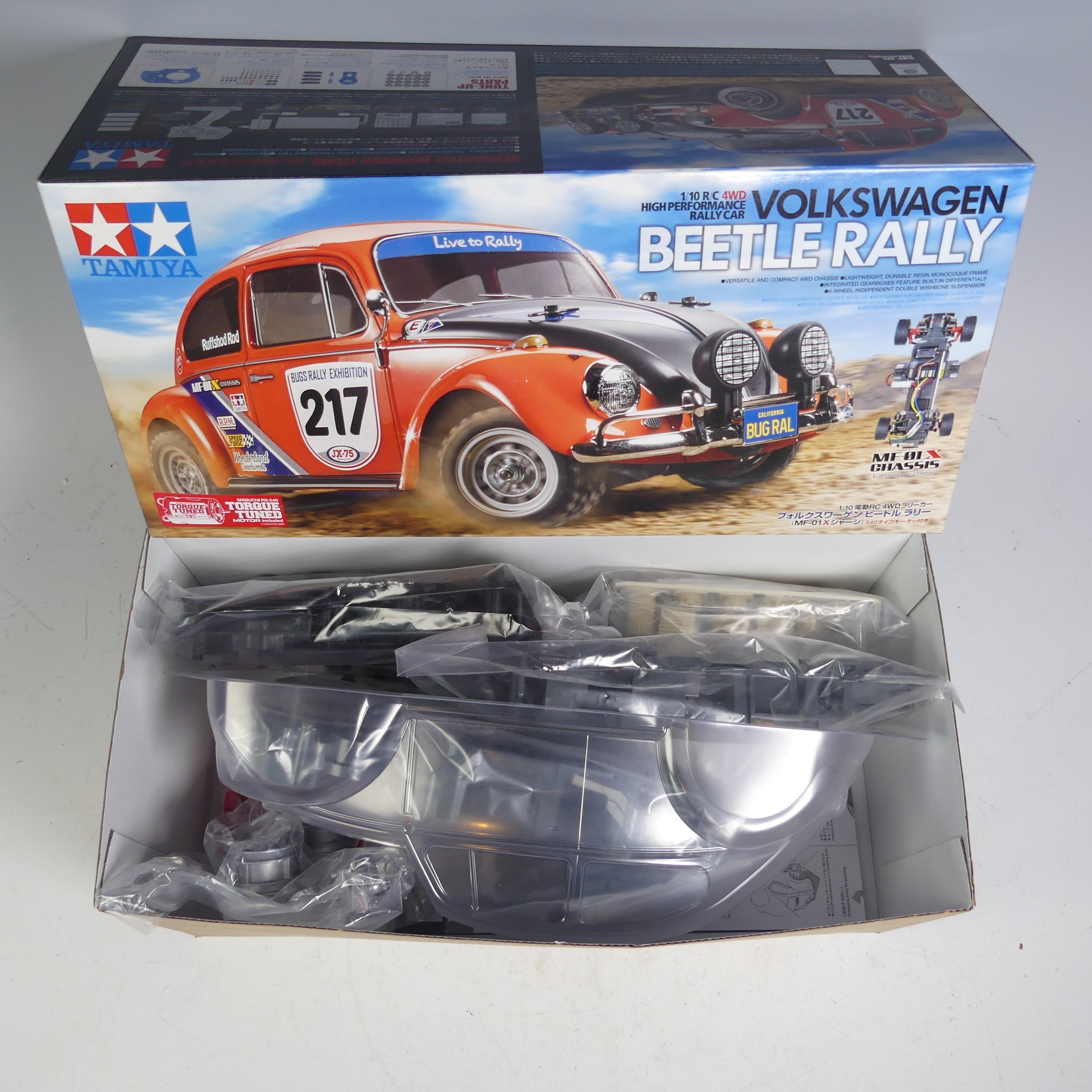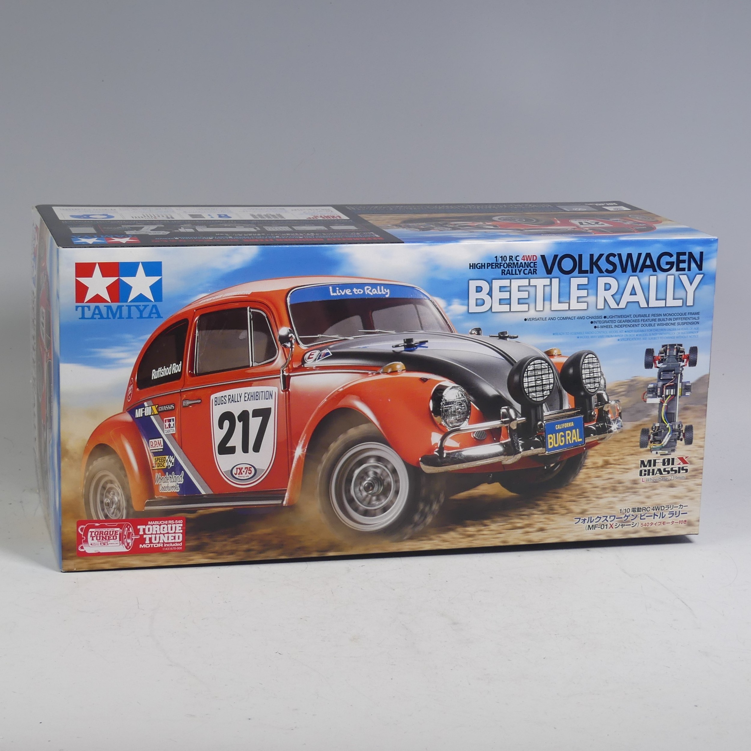 A boxed Tamiya 1:10 scale radio control Volkswagen Beetle Rally Car, MF-01 shaft driven 4WD chassis, unbuilt.