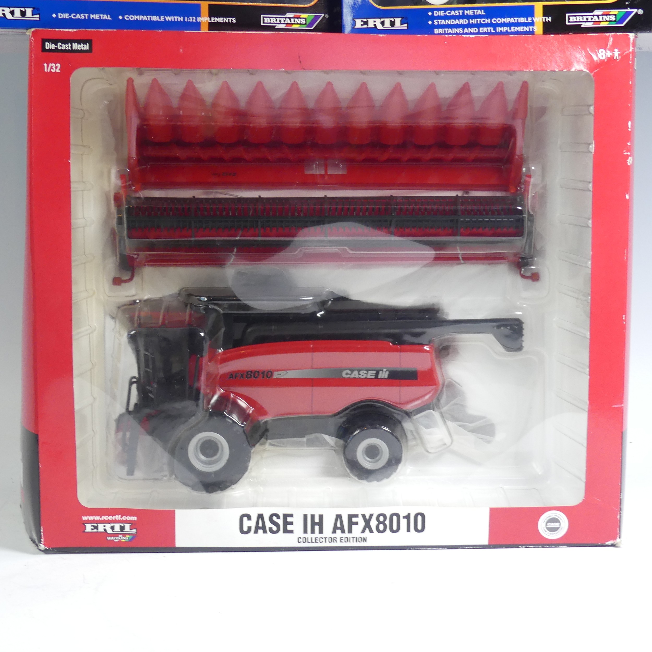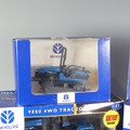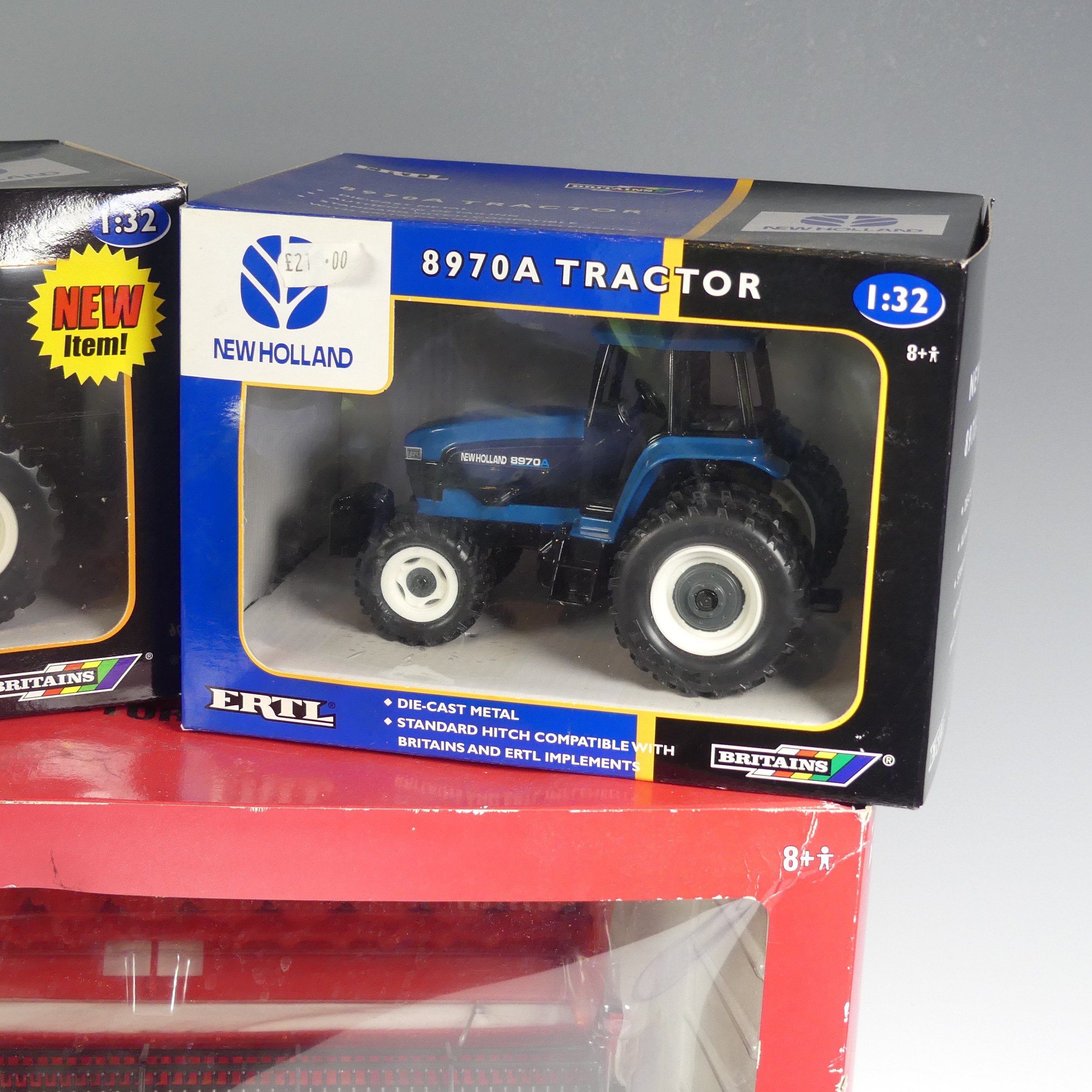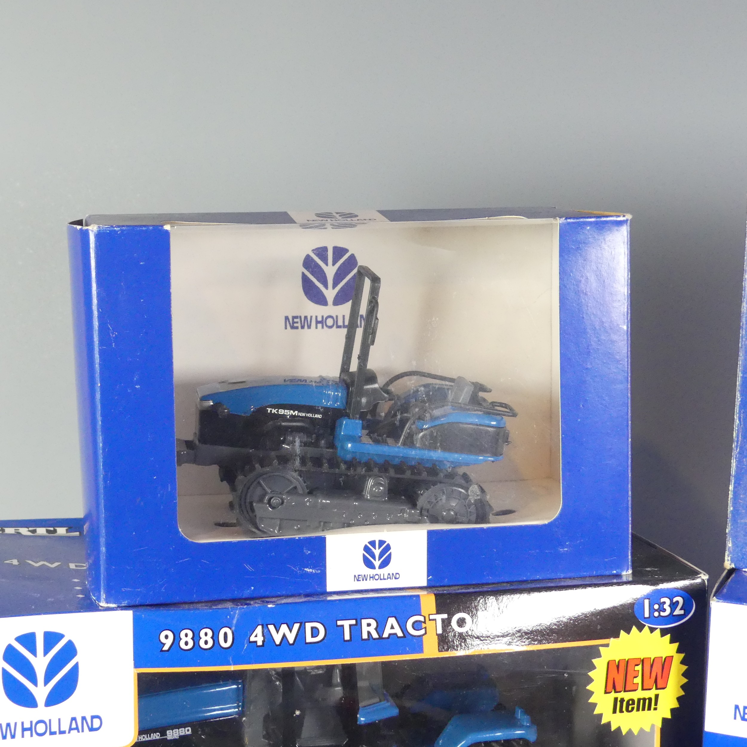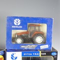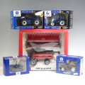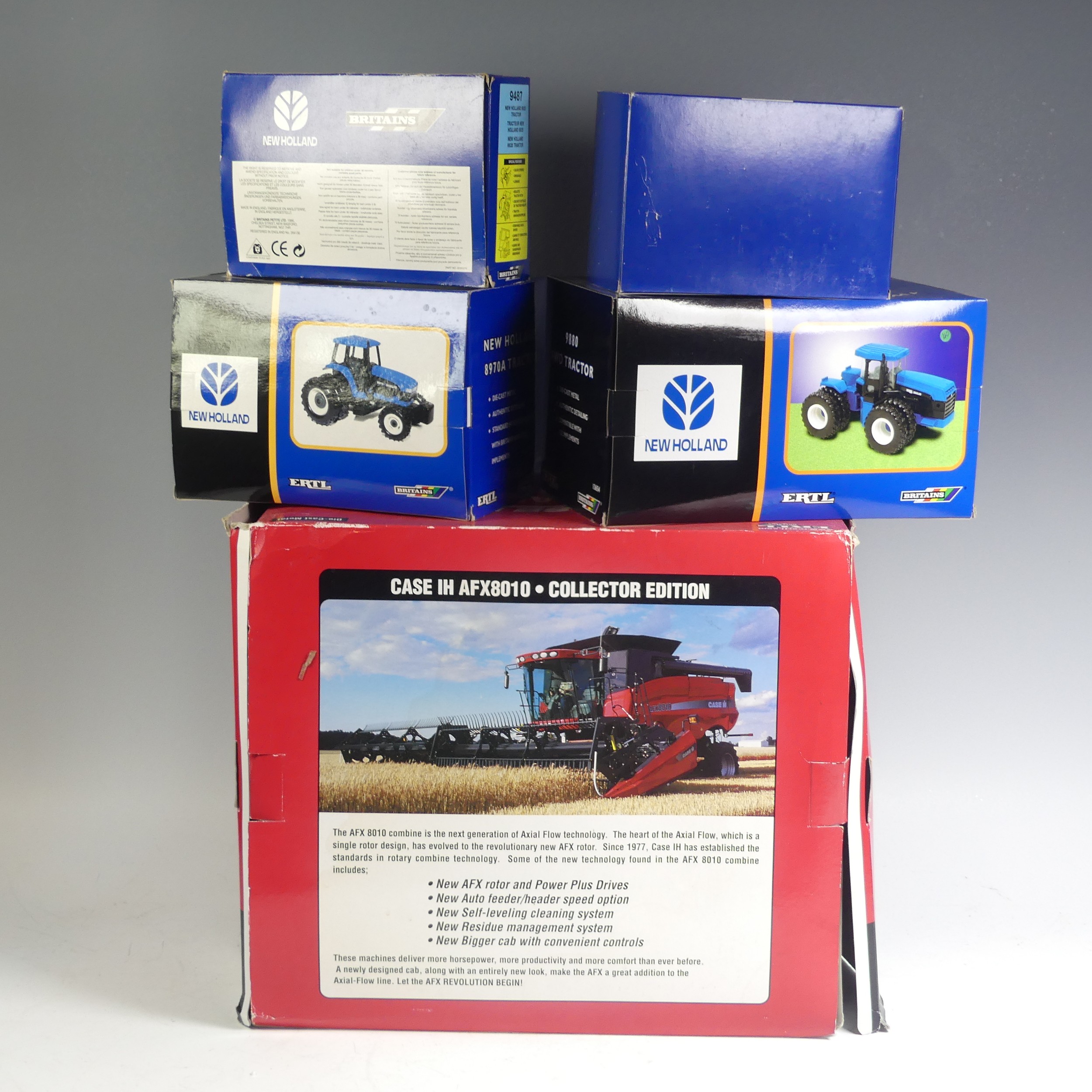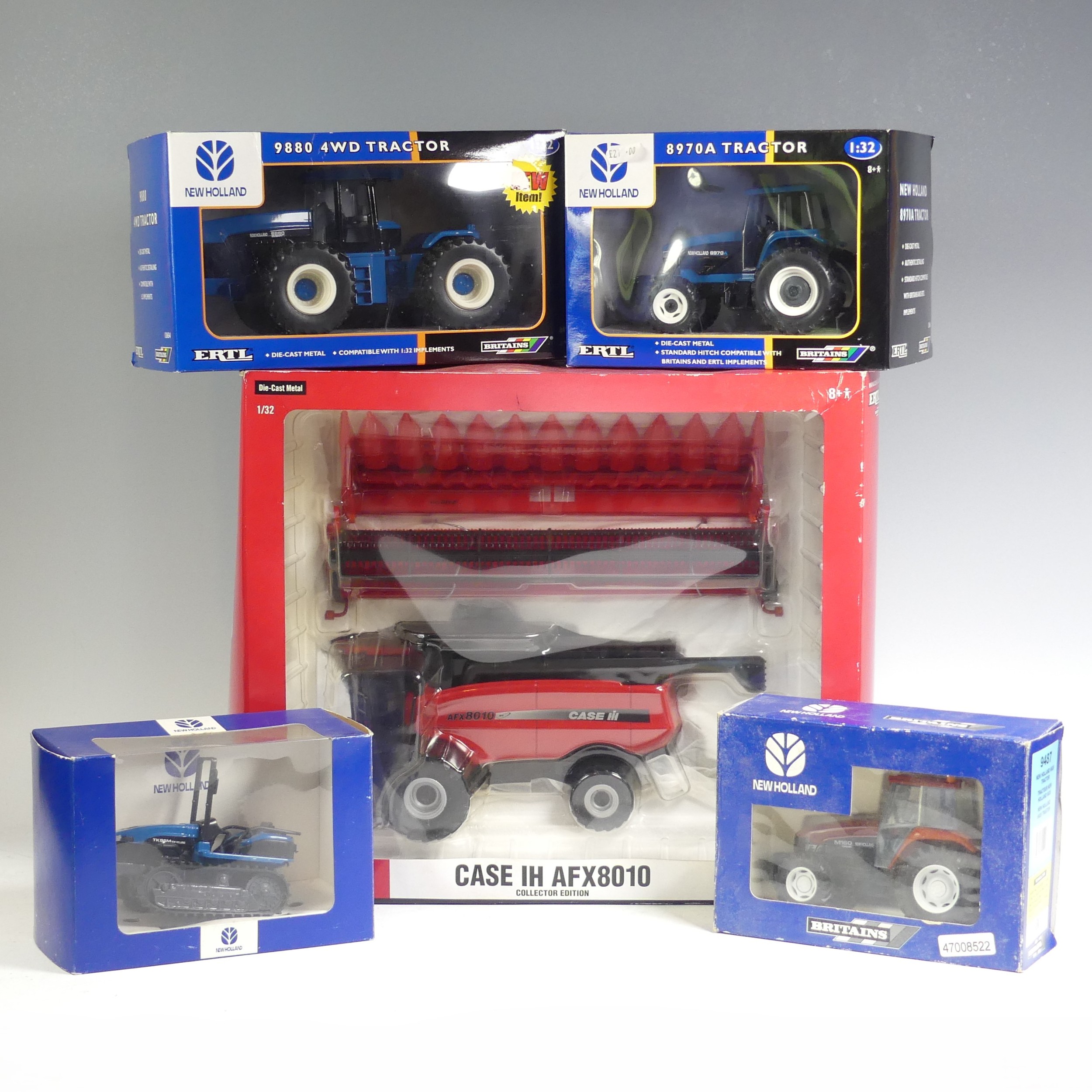 A Britains 1:32 ERTL Case IH AFX8010 model Combine Harvester, together with a Britains 1:32 ERTL New Holland 9880 4WD model Tractor, a Britains 1:32 ERTL New Holland 8970A model Tractor, a 1:32 New Holland TK95M Crawler Tractor, and a Britains 1:32 New Holland 6635 model Tractor, all boxed(5)