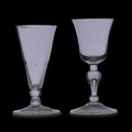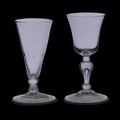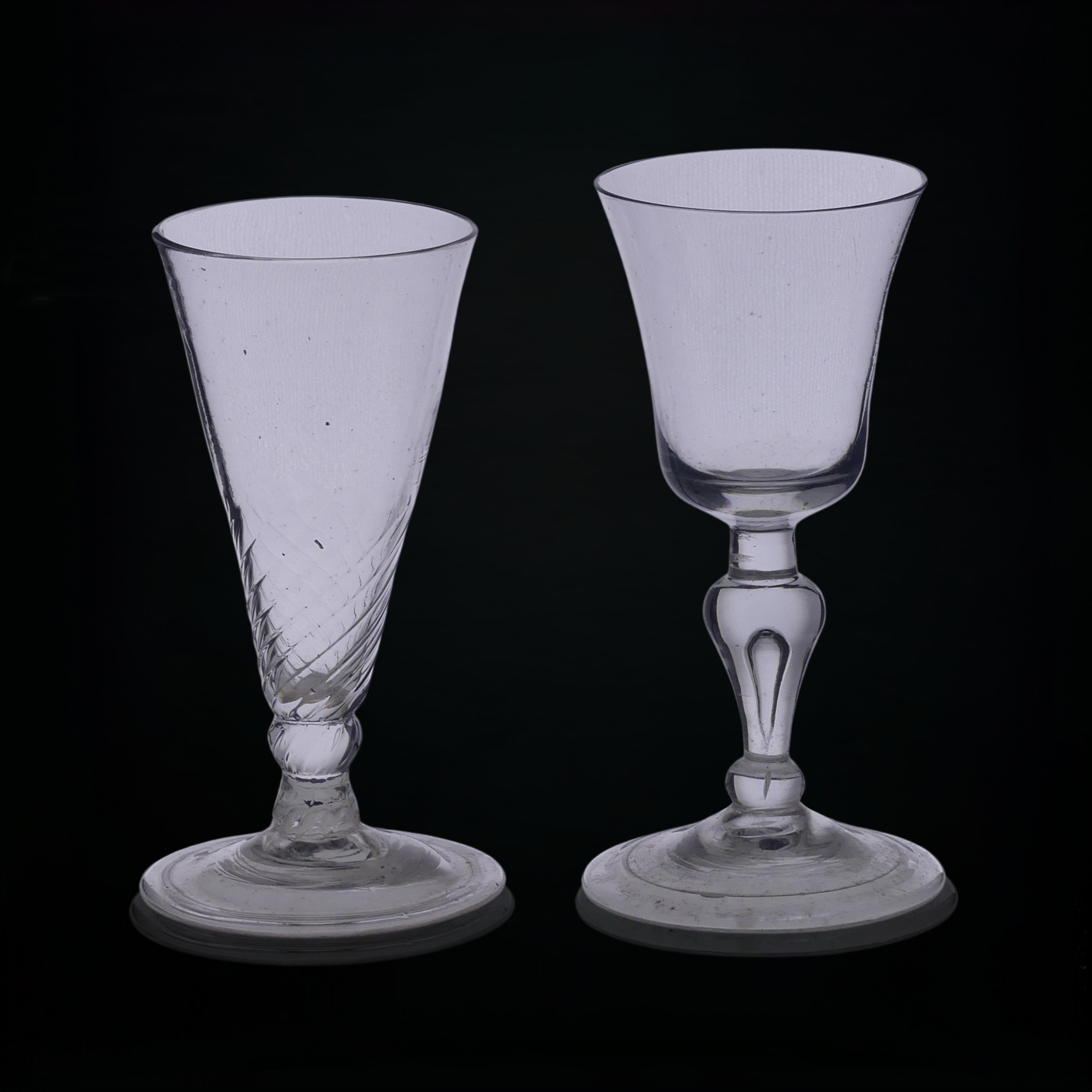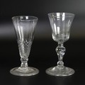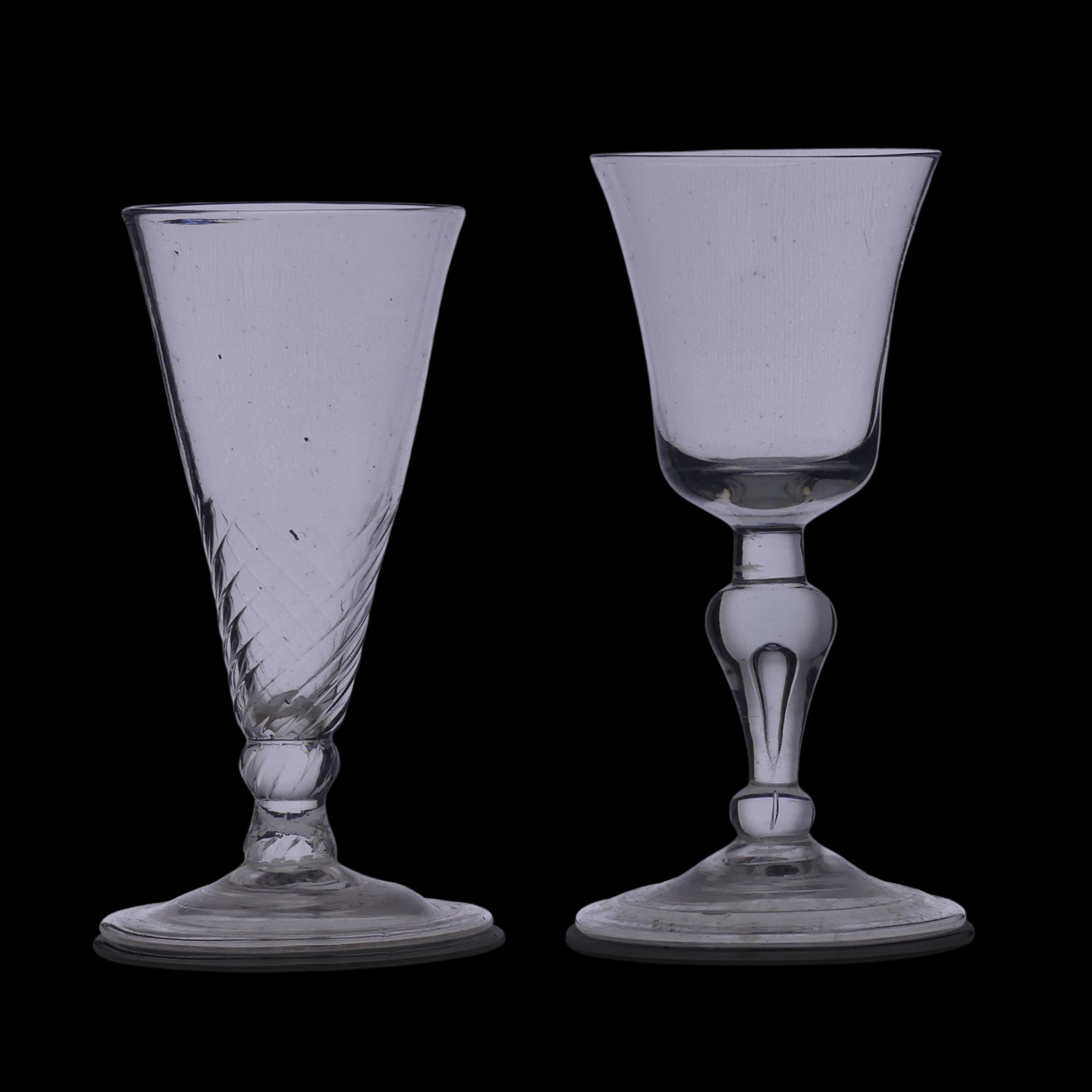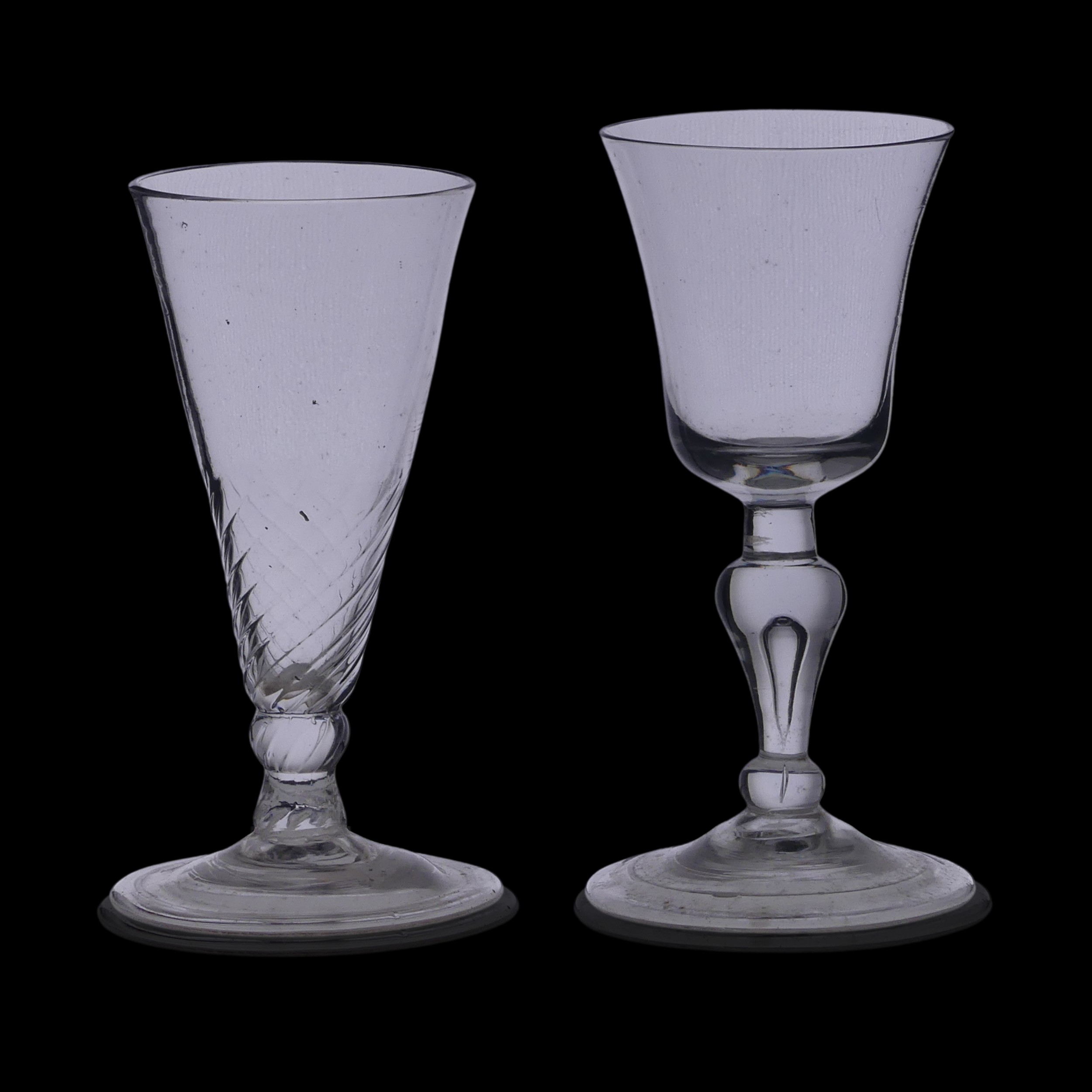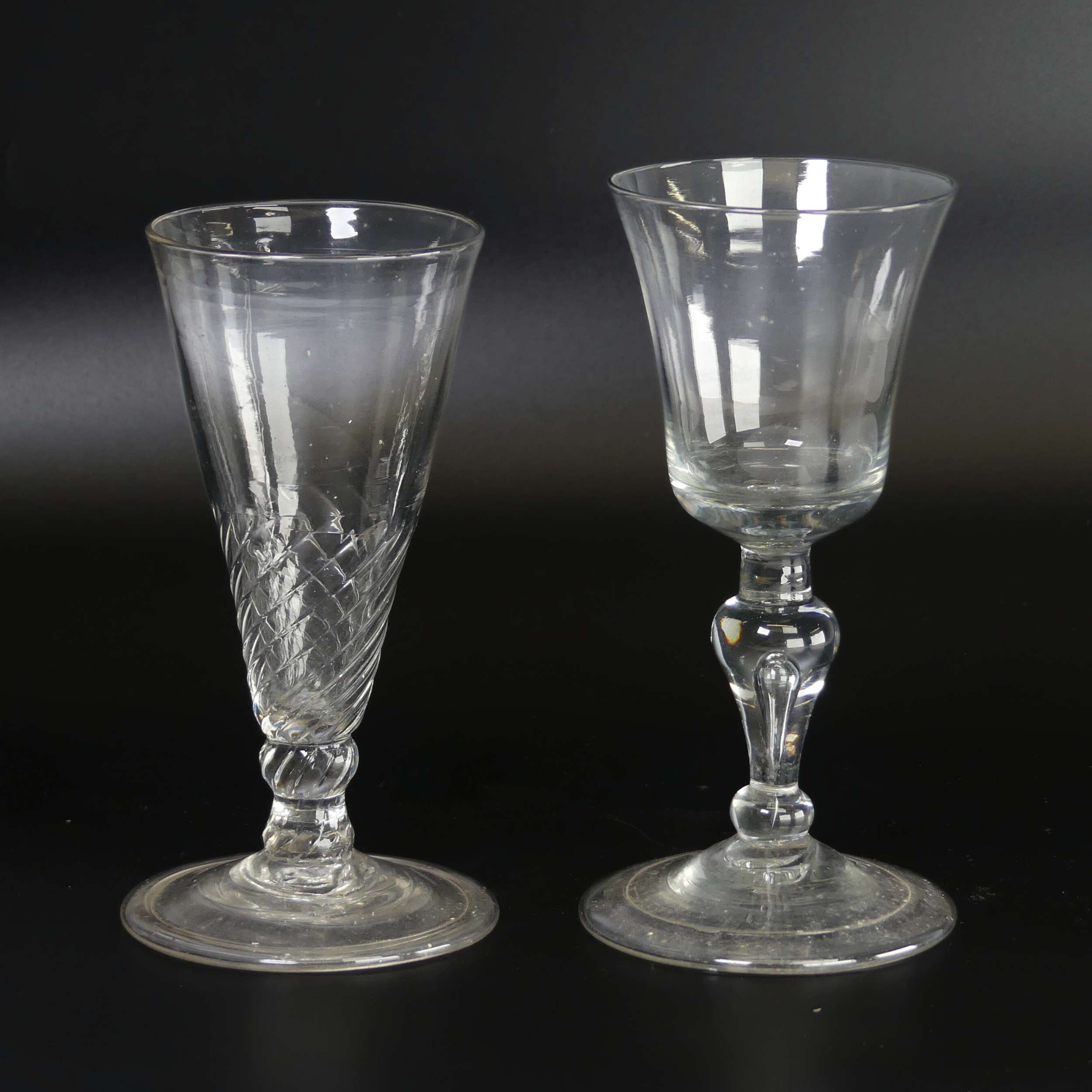 A Georgian Wrythen conical Wine Glass, with elongated conical bowl, knopped stem and flared foot, H 13.5cm, together with a Georgian Wine Glass, with knopped stem with controlled bubble within and flared bowl, H 14cm (2)