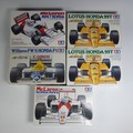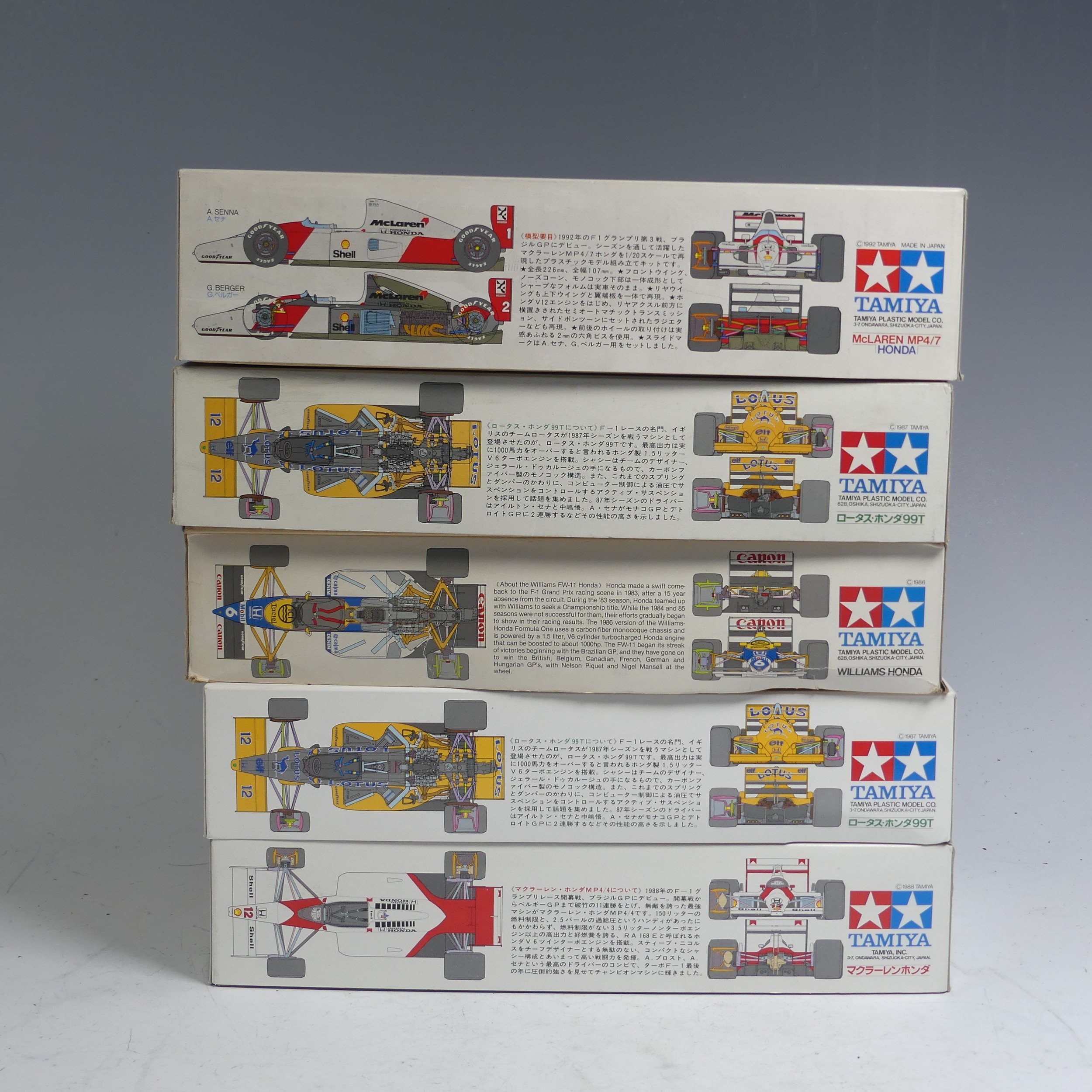 Two boxed Tamiya 1:20 Grand Prix Collection No 20 Lotus Honda 99T plastic model Kit, (complete and unbuilt), together with a boxed Tamiya 1/20 Grand Prix Collection No 35 McLaren MP4/7 Honda plastic model kit, a Boxed Tamiya 1/20 Grand Prix Collection William FW 11 Honda F-1 plastic model kit, and a boxed Tamiya 1/20 Grand Prix Collection No 22 McLaren Honda MP4/4 plastic model kit, all complete and unbuilt(5)