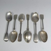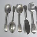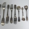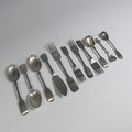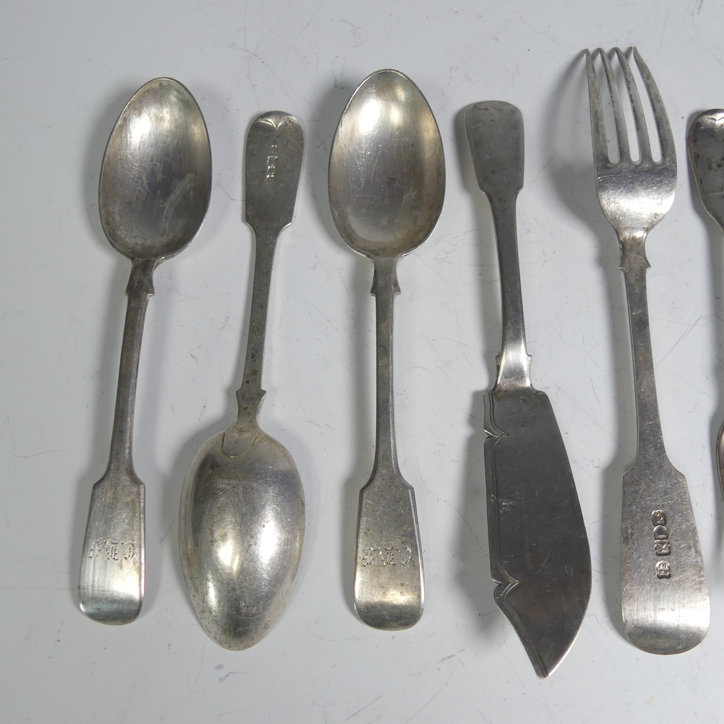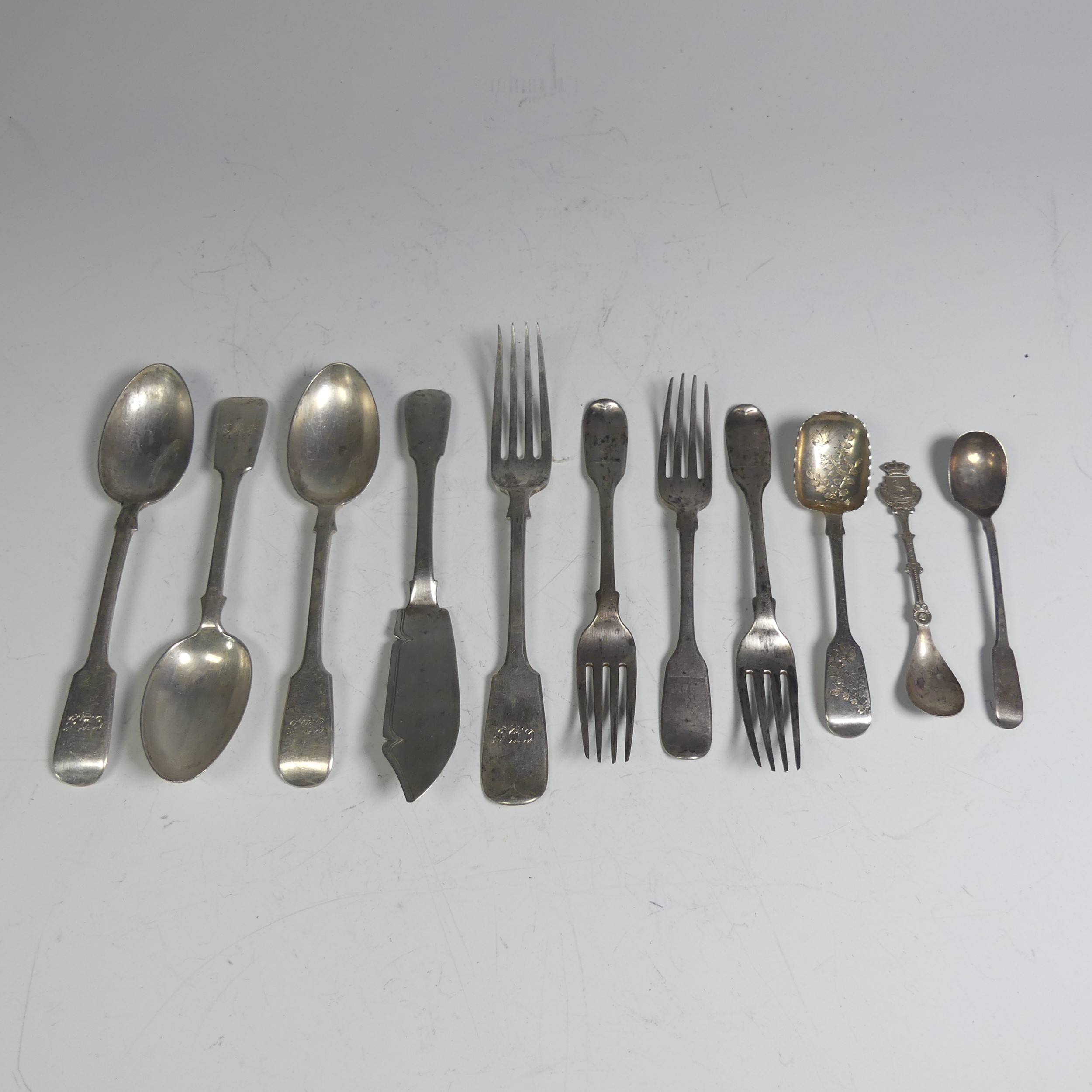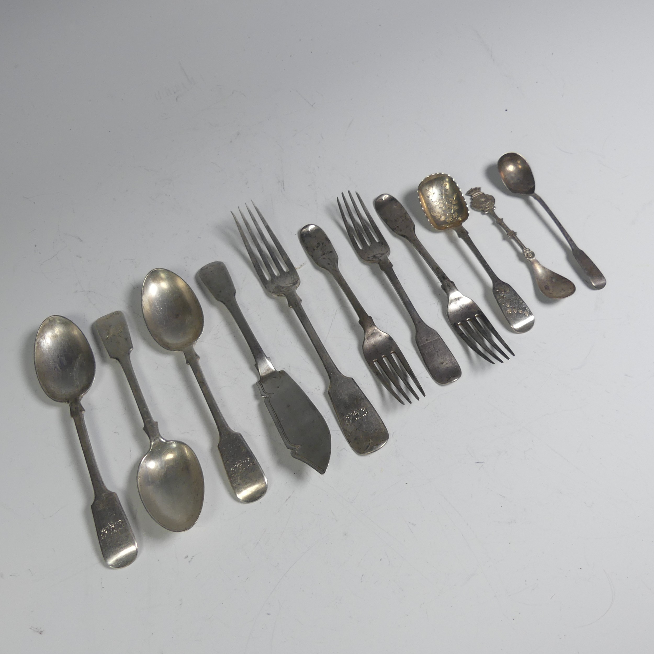 A set of three late Victorian silver fiddle pattern Dessert Spoons, by Josiah Williams & Co., hallmarked London 1899, initialled, 18.5cm long, together with a quantity of other silver flatware including a Victorian sugar spoon in the Aesthetic style, London 1844, approx. total weight 15.3ozt (a lot)