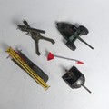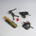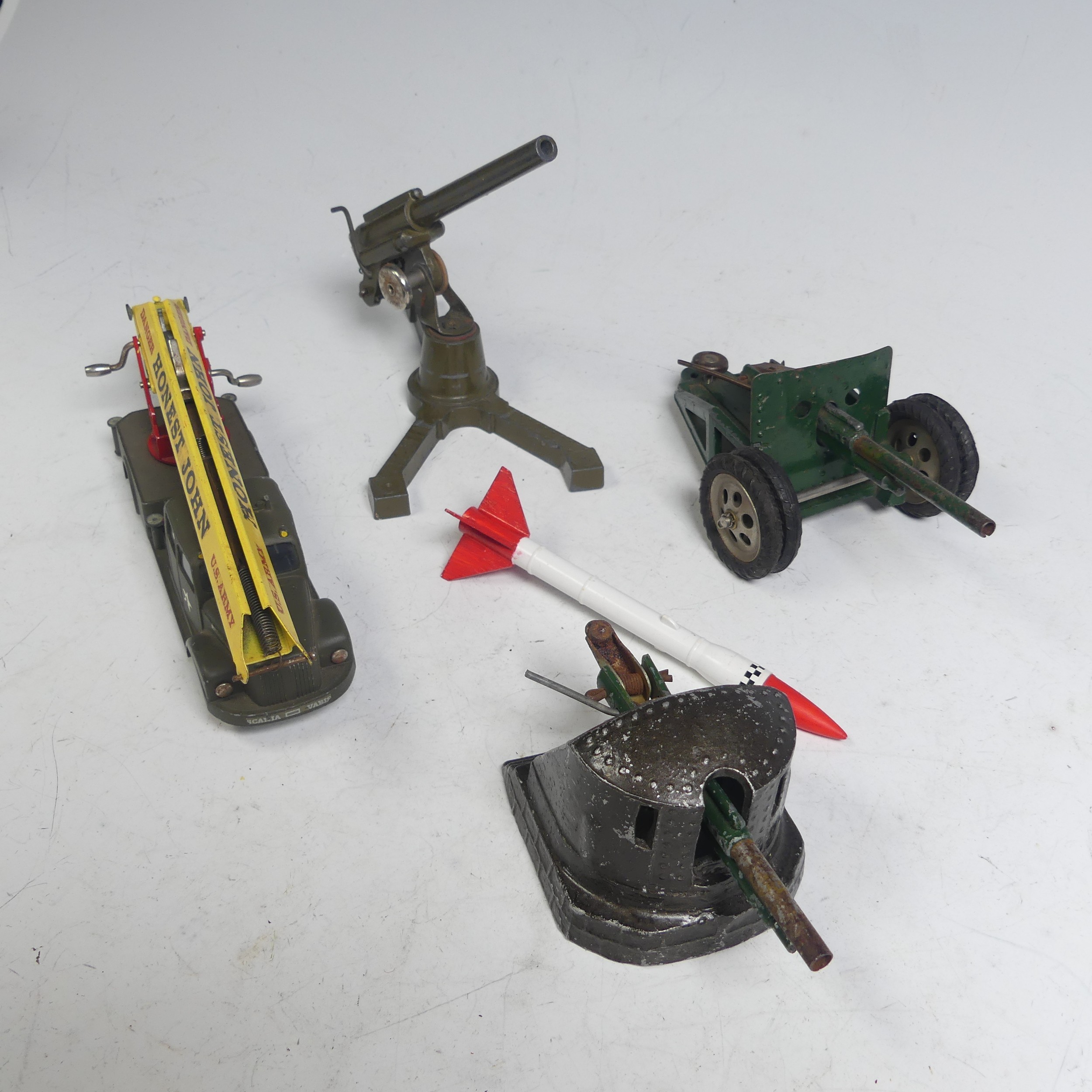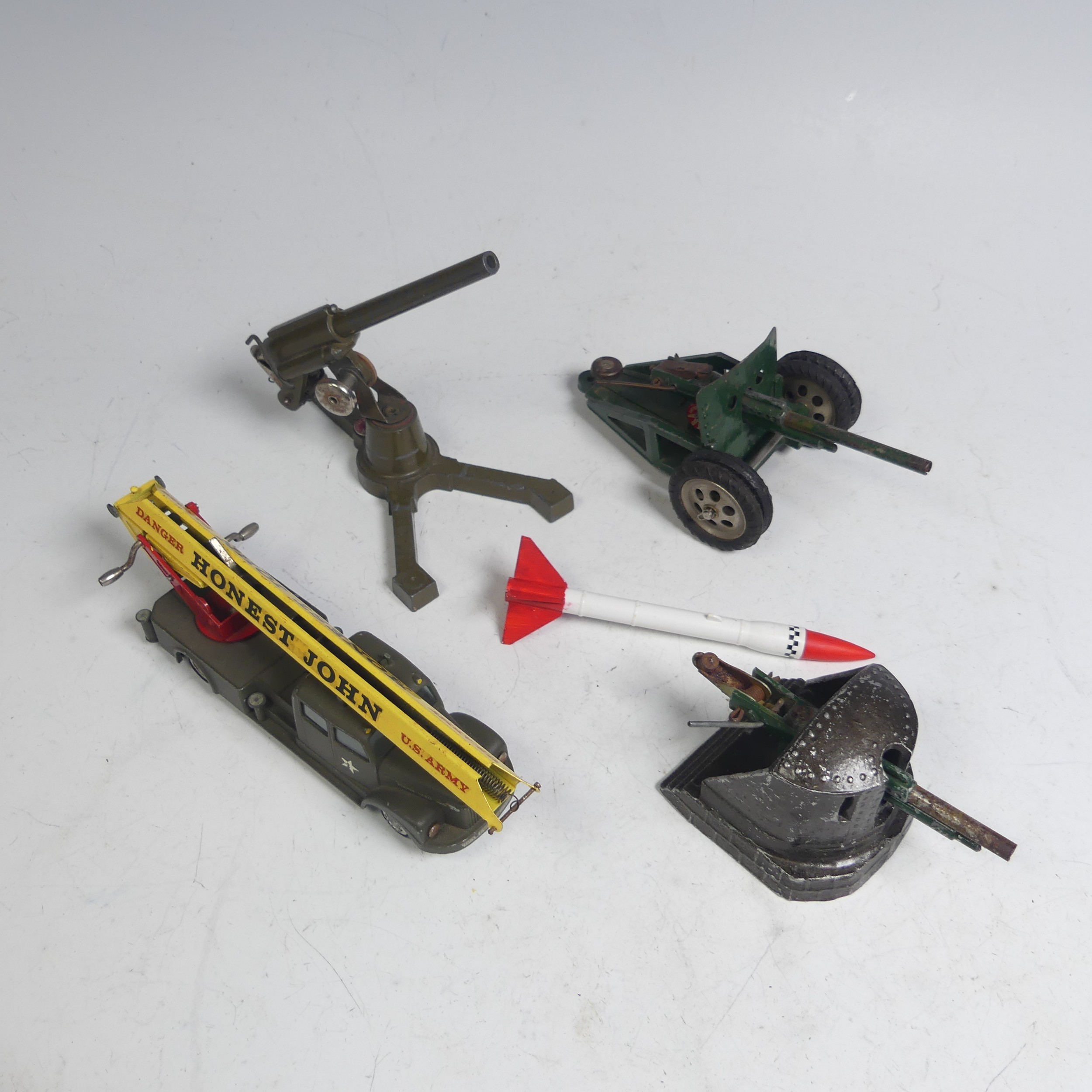 Tekno; unboxed playworn No.445 "US Army" Honest John Missile Launcher, with white star on bonnet and doors with replacement red and white missile, together with three unboxed playworn Astra military Guns(4)