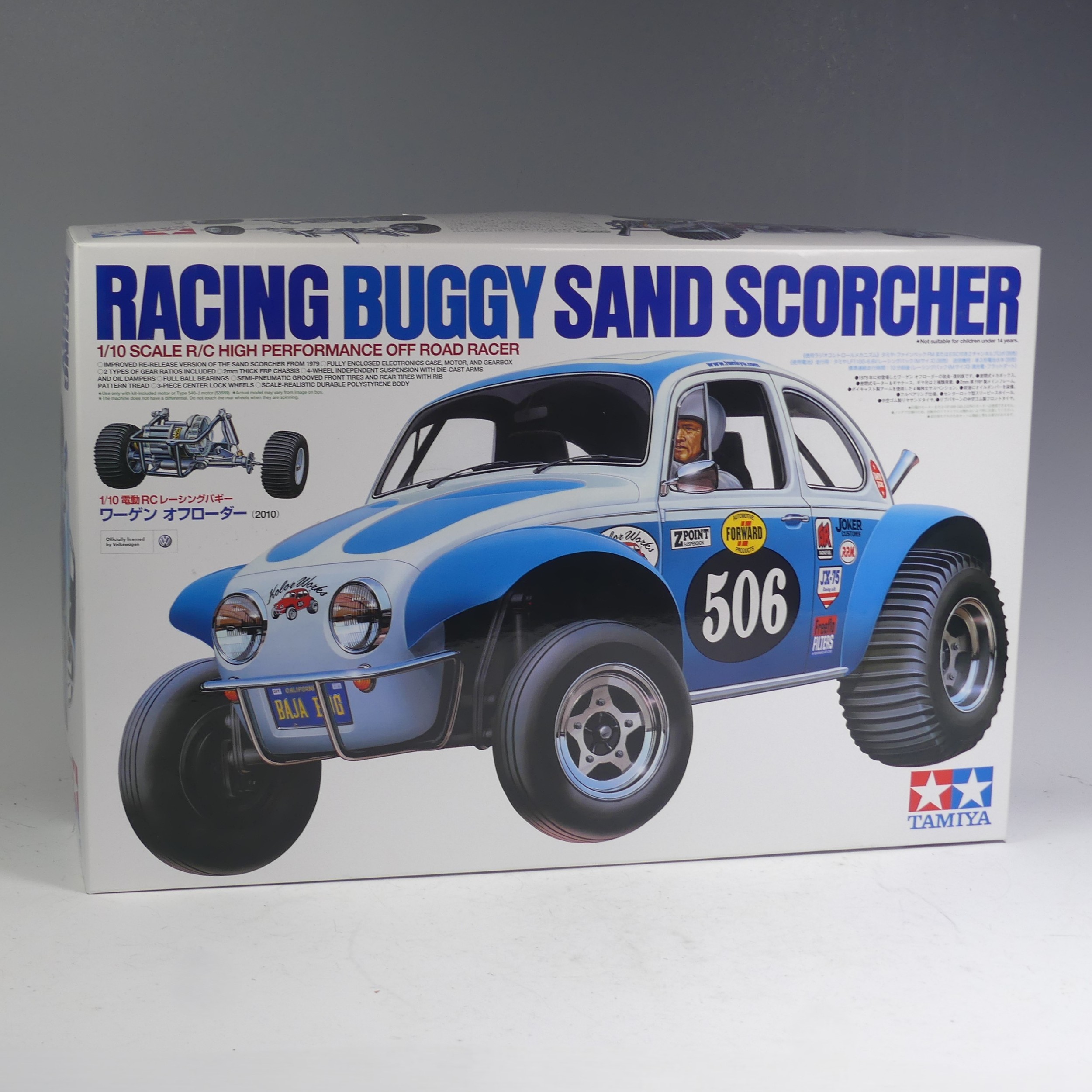 A boxed Tamiya 1:10 scale radio controlled R/C off road racing Buggy Sand Scorcher, item no. 58452-60A, appears complete with instructions, decals and relevant accessories, unbuilt.