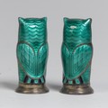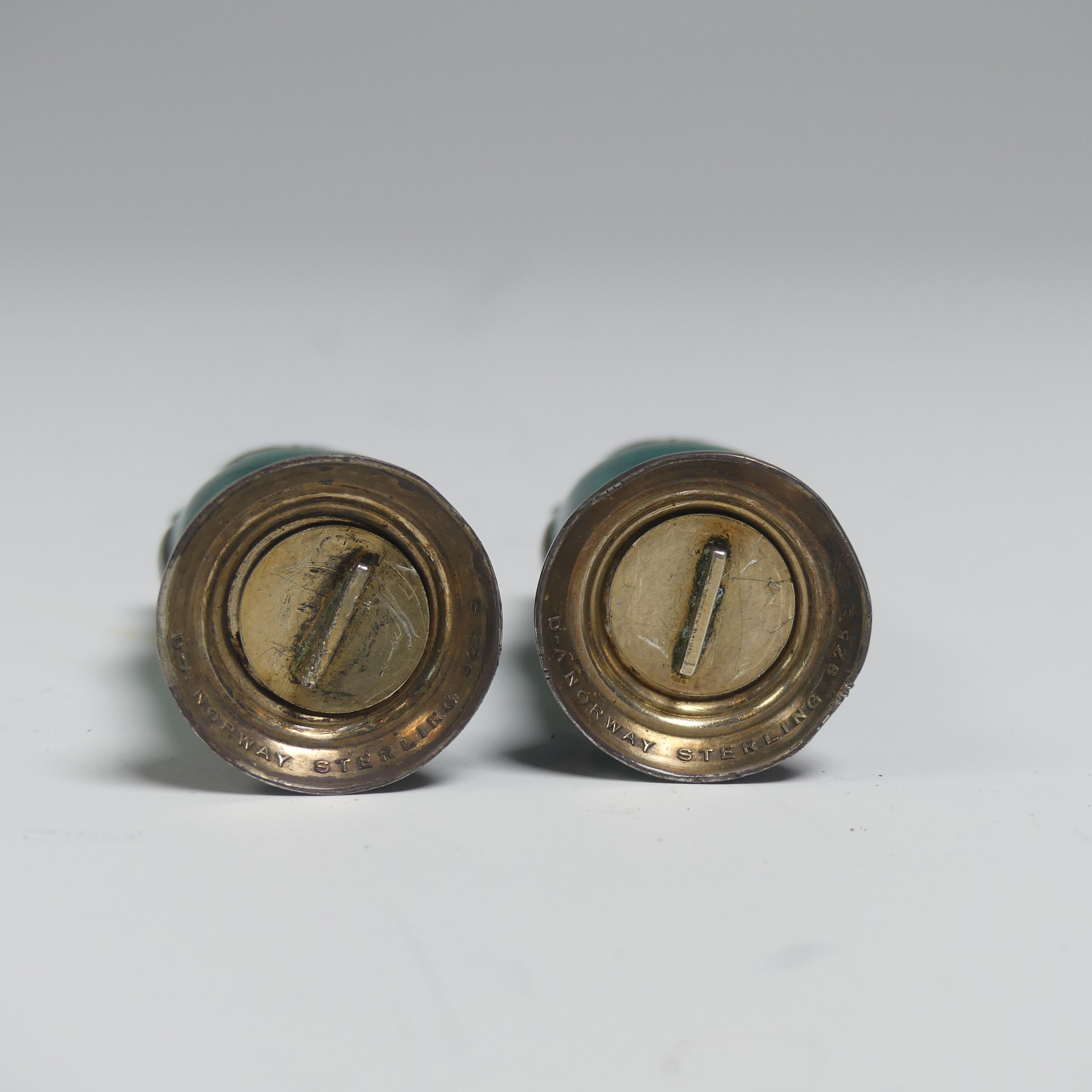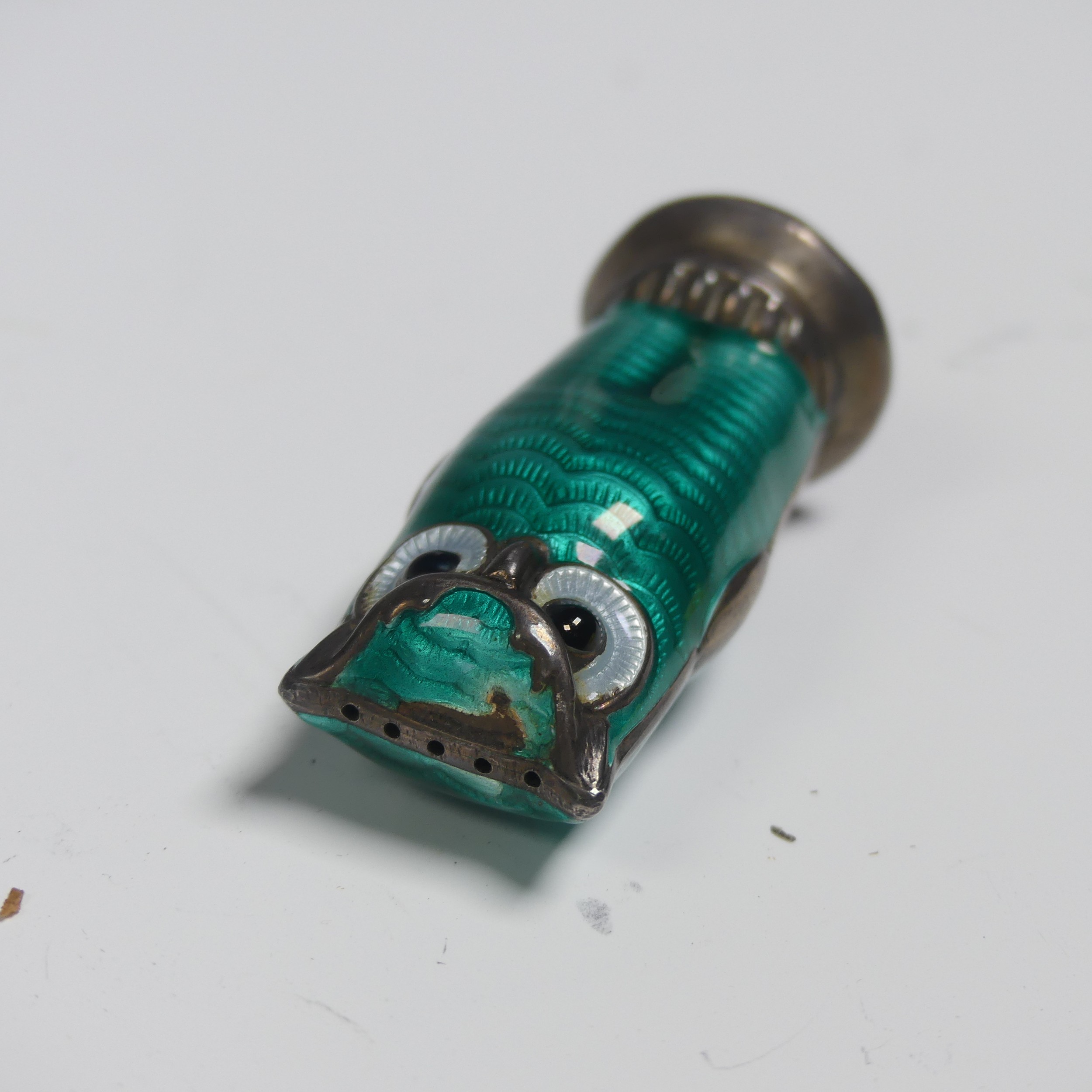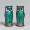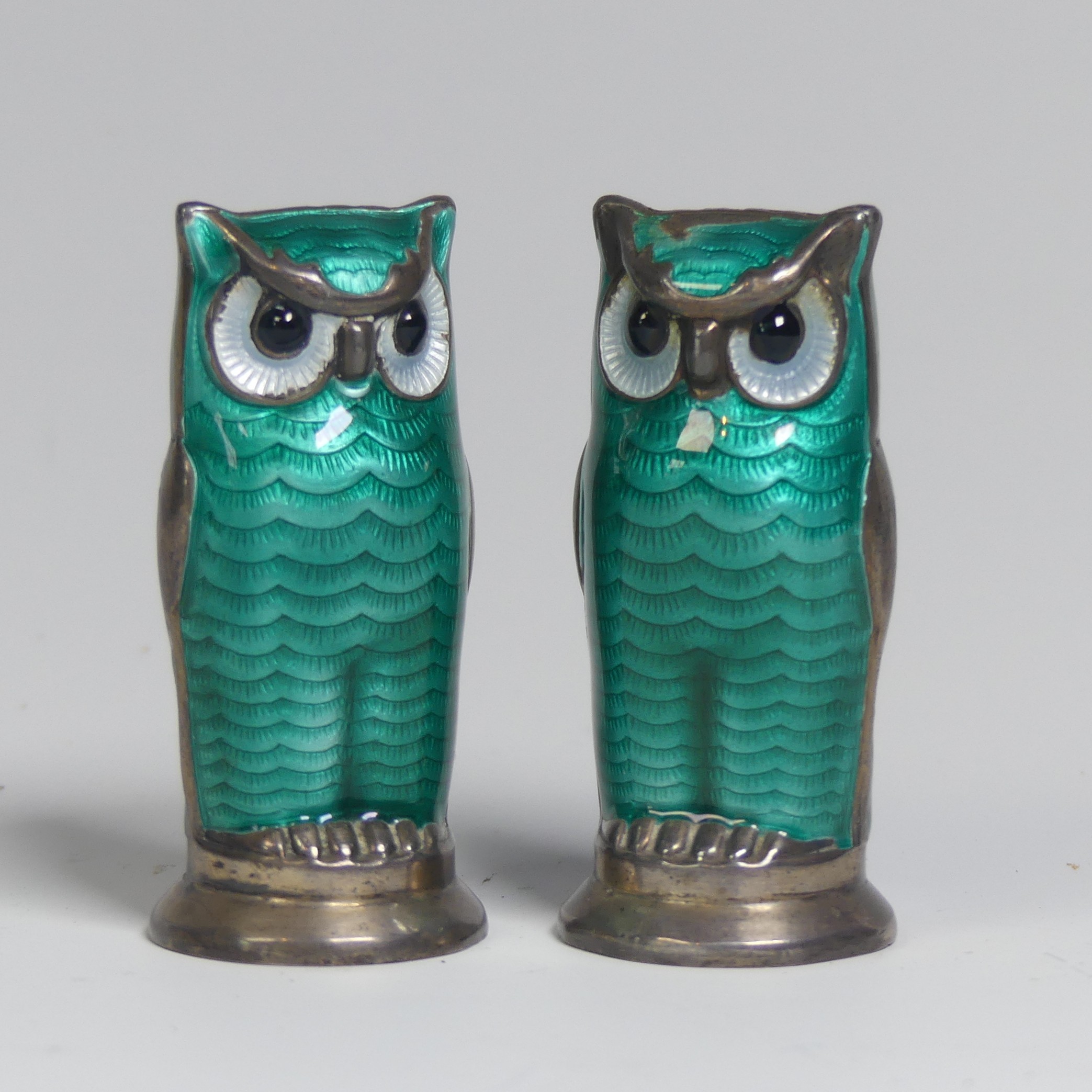 David Andersen; A pair of novelty silver and enamel owl Pepper Pots, the circular bases marked 'D-A Norway Sterling 925S', 5cm high, total weight 47.5g, one with some enamel loss, see images (2)