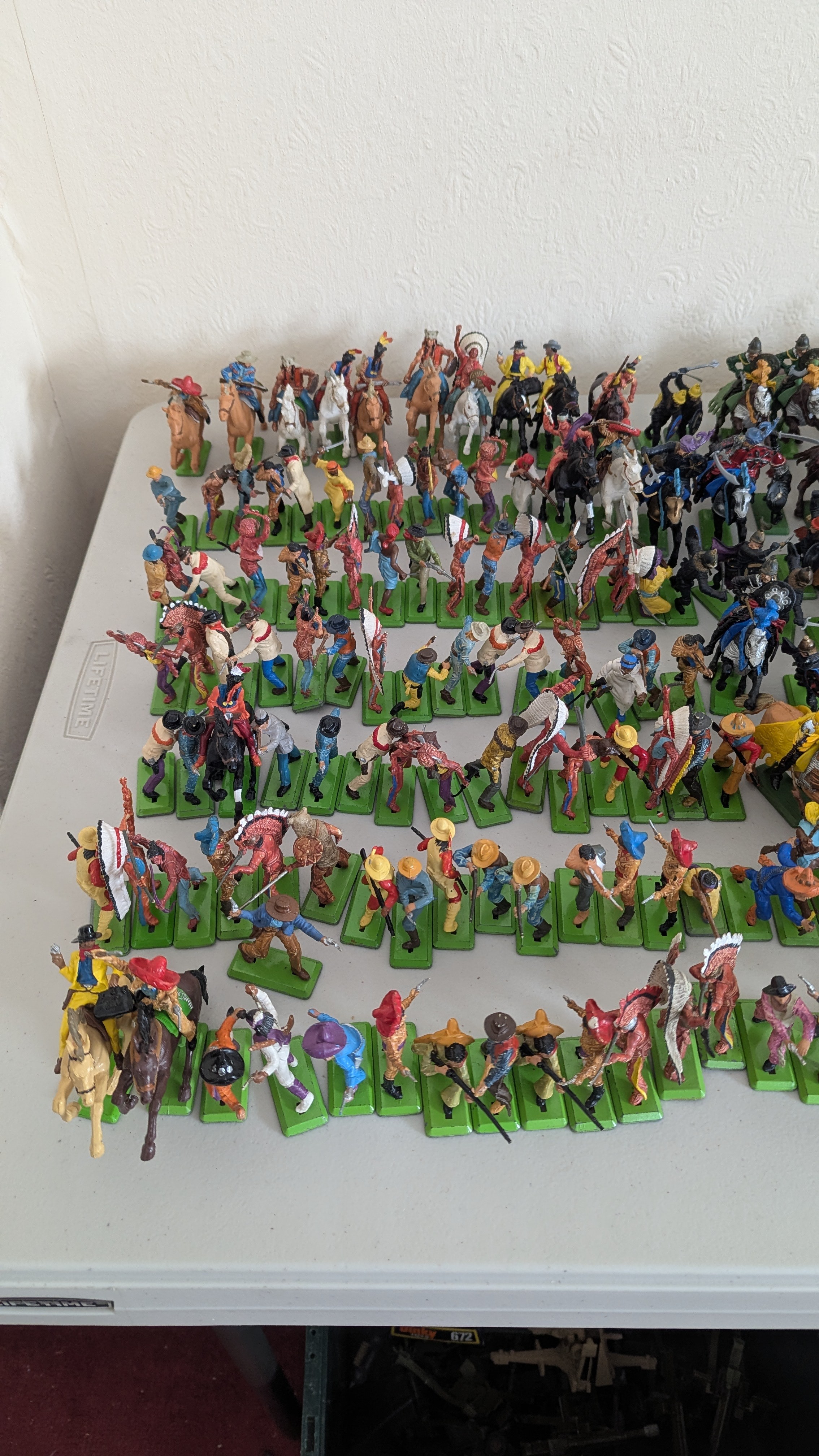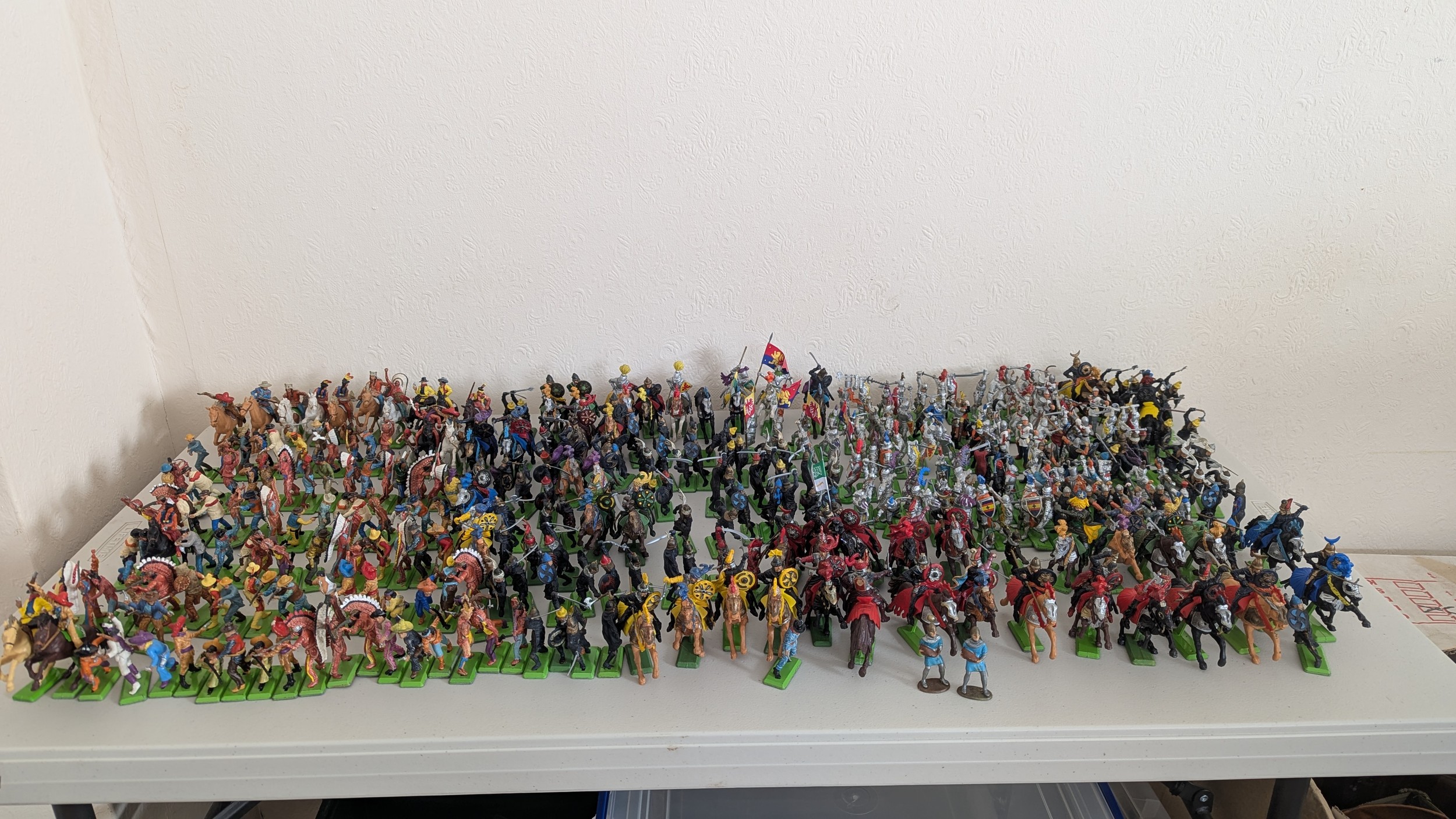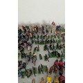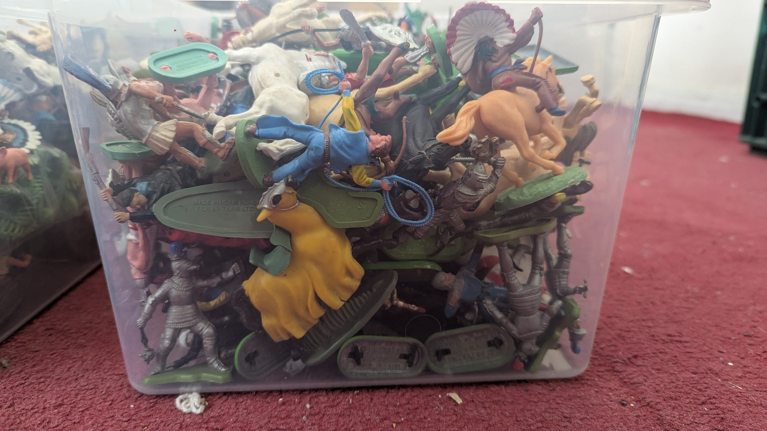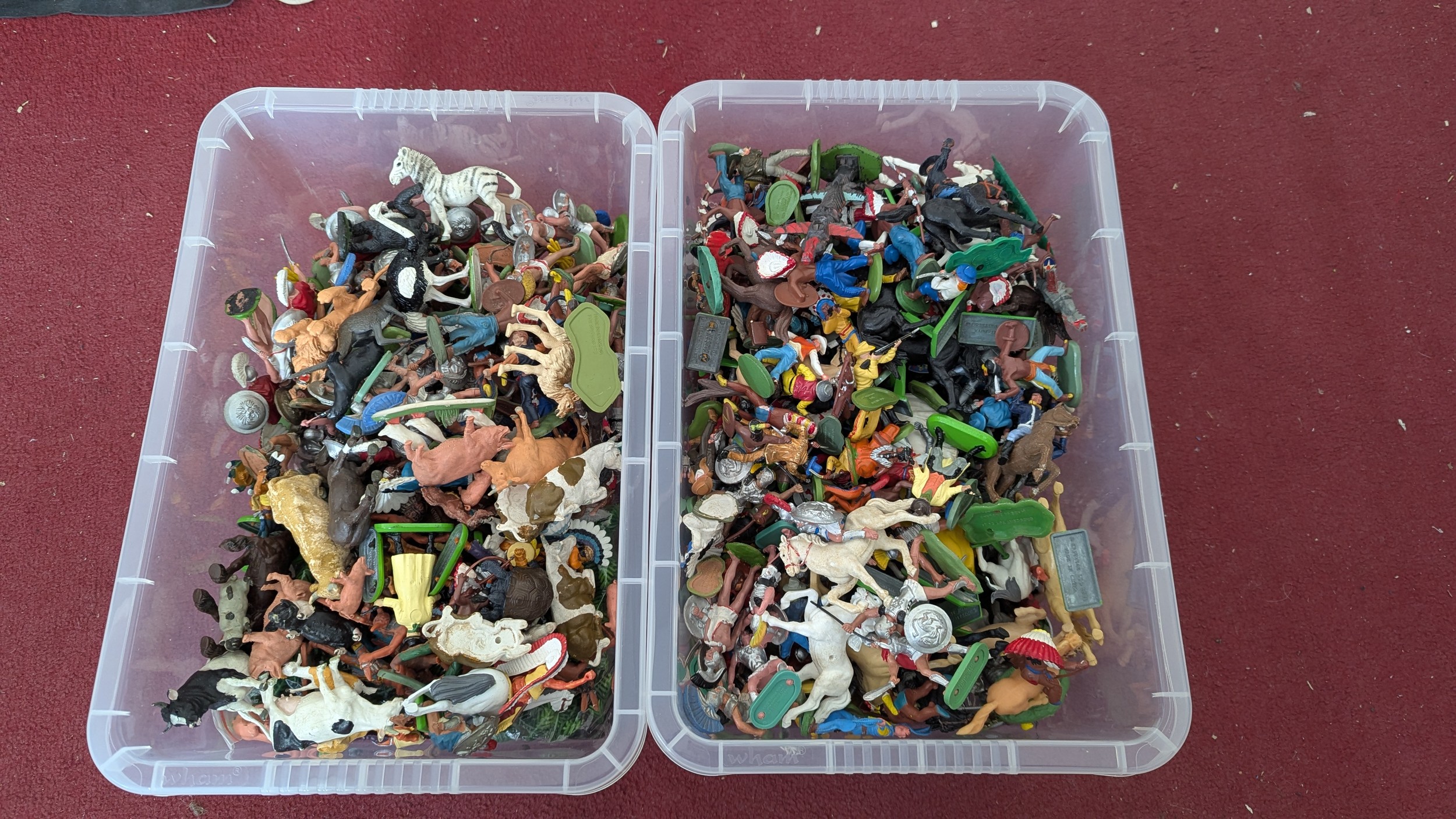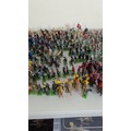 Britains Deetail; A very large collection of unboxed playworn Knights, Turkish, Cowboys and Indian Figures, approximately 300 total, some on horseback, note some have small looses and damages, together with a large collection of China and Hong Kong made plastic playworn Britains Knights, Indians, Cowboys and Farmyard Animals, over 200 in total, also with buildings, canoes, trees, etc, note some with losses and damages(a lot)